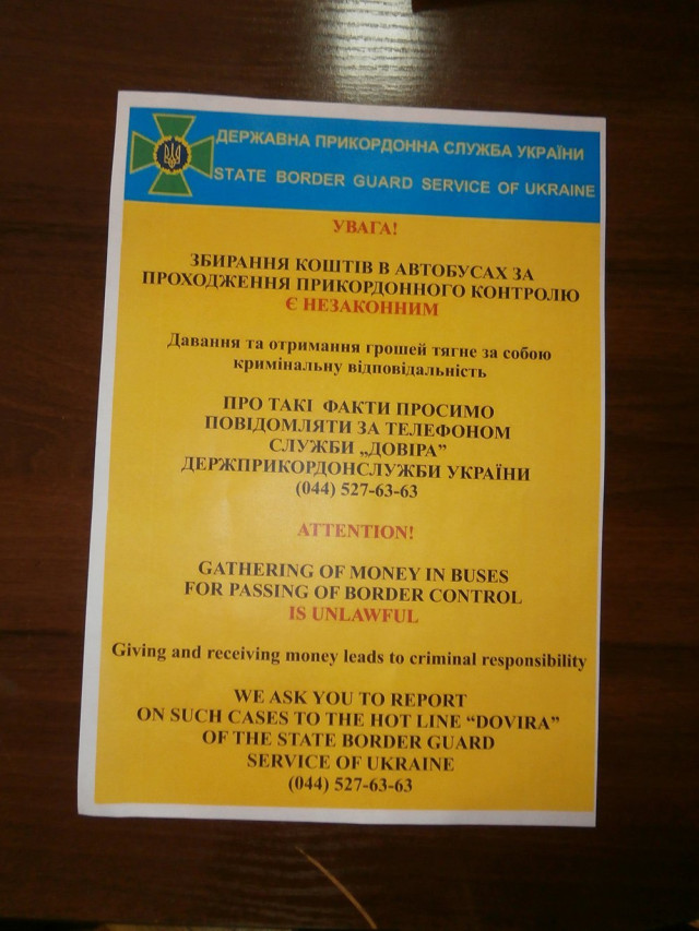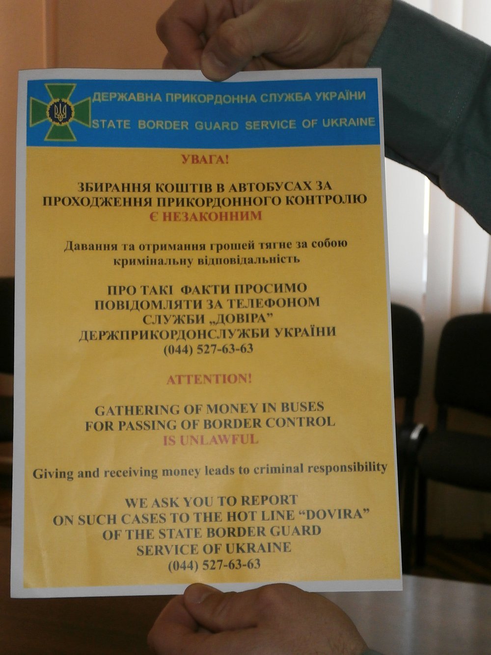 «Хочу наголосити, аби громадяни знали: прикордонний контроль – перевірка документів пасажирів, транспорту, багажу – здійснюється безкоштовно.– Номери «телефонів довіри» розміщені на стендах у пунктах пропуску. На прикордонних автостанціях і в автобусах міжнародного спрямування розклеєні інформаційні матеріали про те, що збирання якихось коштів і передача їх співробітникам прикордонної чи митної служби – це протиправні дії, що потрапляють під кримінальні статті про шахрайство і давання хабара.