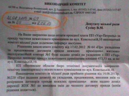Так, відповідно до рішення № 220 від 14.08.2013 року виконавчий комітет міської ради дозволяє дирекції ЖЕК №1 згідно проведеної технічної інвентаризації нежитлового приміщення по вулиці Ковельській, 10 внести зміни до чинного договору оренди з ПП «Укр-Петроль», збільшивши орендовану площу з 453,55 метрів квадратних на 551,3 метрів квадратних.