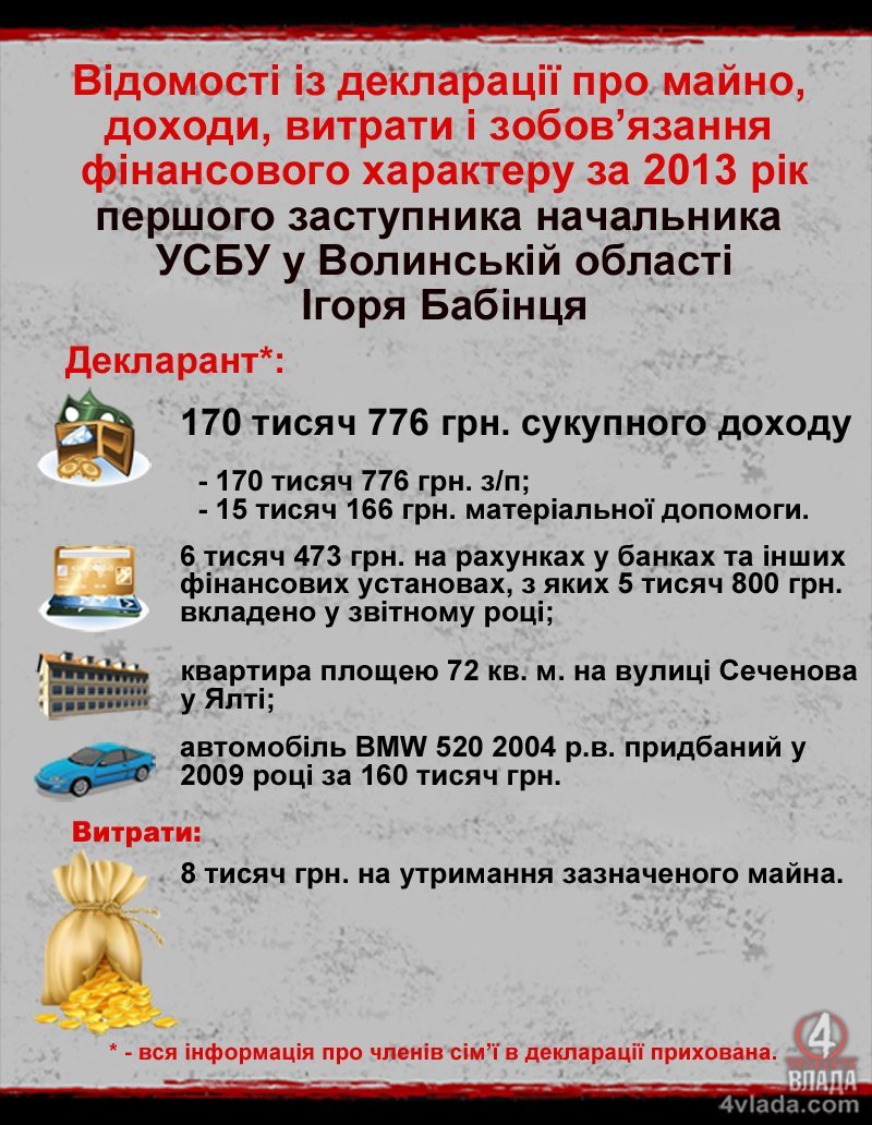 Перший заступник начальника УСБУ у Волинській області Ігор Бабінець за 2013 рік задекларував 170 тисяч 776 гривень доходу. Усе це, як вказано в його декларації, - зарплата. Крім того, в документі вказано і 15 тисяч 166 гривень матеріальної допомоги.
