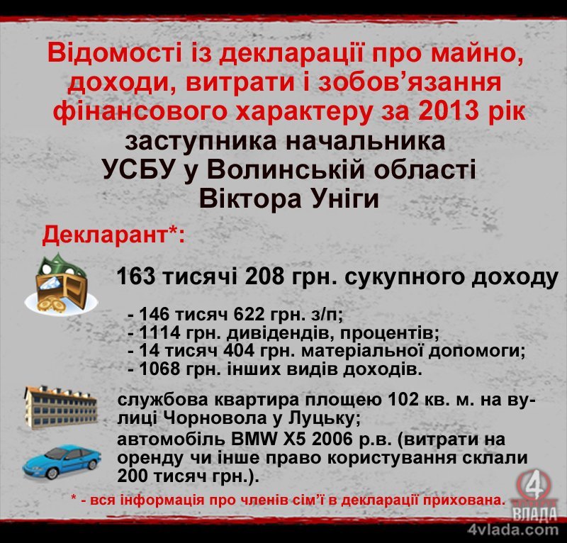 Також у Віктора Уніги значиться службова квартира площею 102 кв. м. на вулиці Чорновола у Луцьку та автомобіль «BMW X5» 2006 року випуску, витрати на оренду чи інше право користування яким склали 200 тисяч гривень.Як вже зазначалося, вся інформація про членів сім’ї в усіх документах вилучена.