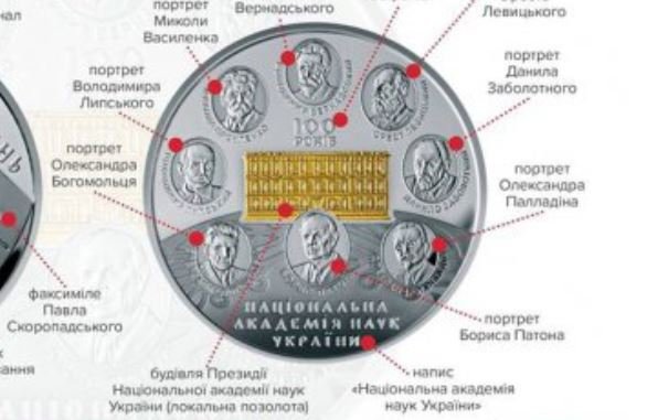 На аверсі монети розміщено Малий герб України. У центрі на матовому тлі написи щодо закону про заснування Національної академії наук. Унизу монети знаходиться відбиток печатки Української держави. На реверсі монети у центрі зображено жовту будівлю Президії Національної академії наук, по колу розміщені портрети президентів академії з підписами.