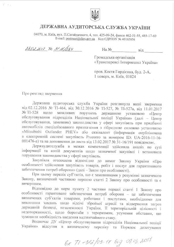 Державна аудиторська служба вважає, що договір на закупівлю гібридних позашляховиків Mitsubishi для Національної поліції "має ознаки недійсності". Про це йдеться у листі-відповіді на запит Transparency International Україна, повідомляє Тиждень з посиланням на dozorro.org.