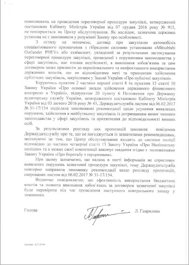 Державна аудиторська служба надіслала замовнику автомобілів рекомендації щодо усунення порушень закону, однак, як ідеться в листі, той не погодився з такими висновками.