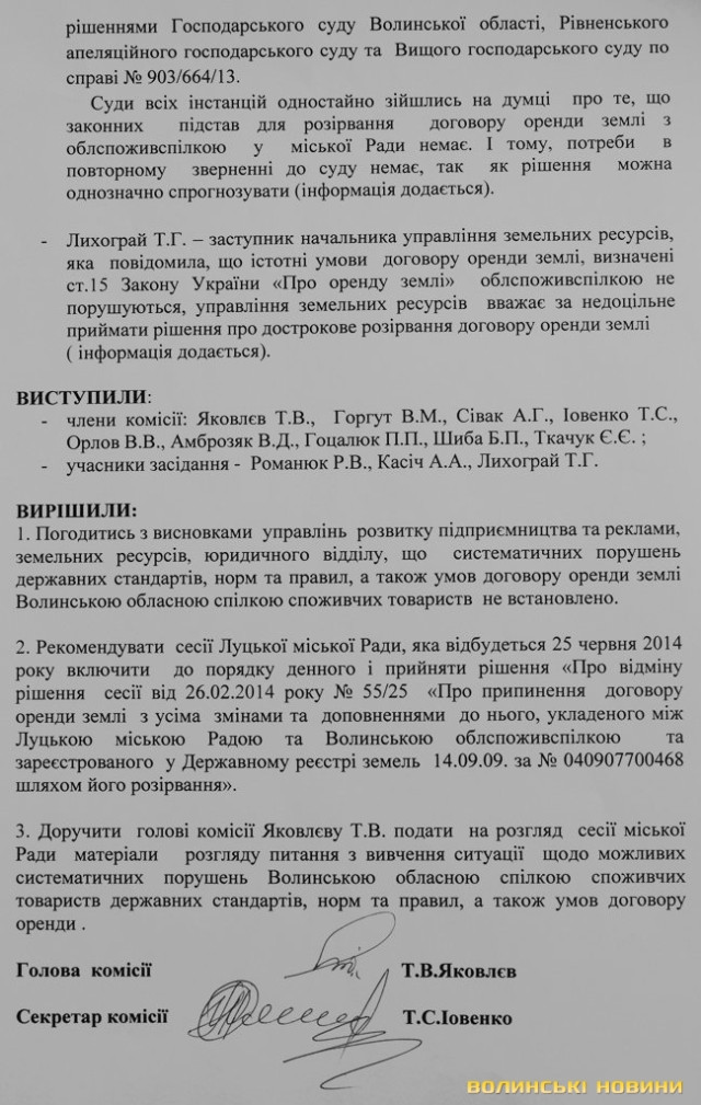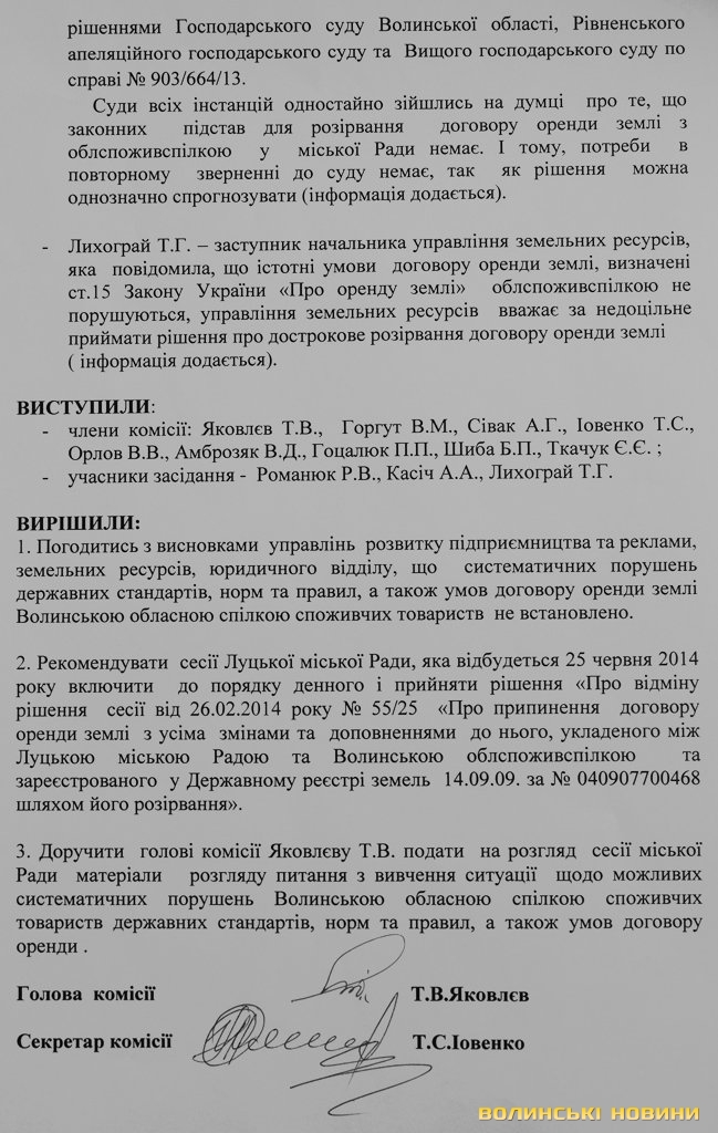 Короткий зміст висновків: «Комісія вирішила, що систематичних порушень облспоживспілкою не було. Також вона рекомендувала сесії Луцької міської ради, яка відбудеться 25-го червня 2014-го року, відмінити рішення про припинення договору з облспоживспілкою».Щодо роботи облспоживспілки сьогодні, депутат міської ради Євген Ткачук поінформував, що між орендарем і підприємцями ринку укладено більше тисячі договорів до 2031-го року зі сталою ціною за квадратний метр - 60 гривень. Та додав, що це найнижча ціна оренди квадратного метра по місту.Після цього у депутатів одразу виникли питання, мовляв, яка доля з цих 60 гривень належить міськраді.