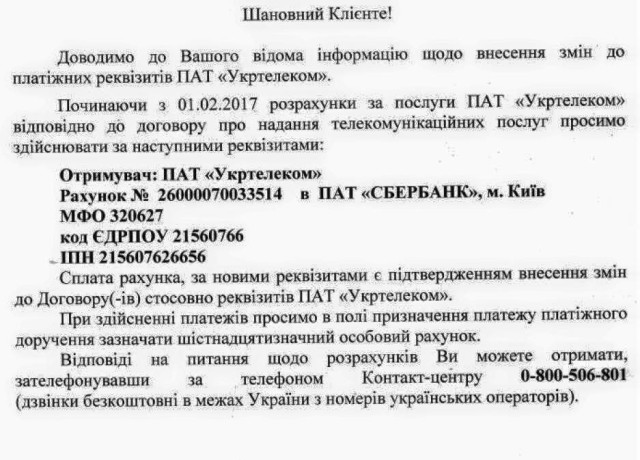 ПАТ «Укртелеком» зробив інформаційну розсилку своїм клієнтам з тим, щоб повідомити, що від 1 лютого 2017 року за надані послуги підприємством його клієнтам слід розрахуватися, сплативши кошти на рахунок Сбербанку Росії. До слова, вартість тарифів на послуги «Укртелекому» з 1 грудня 2016 року збільшилася.