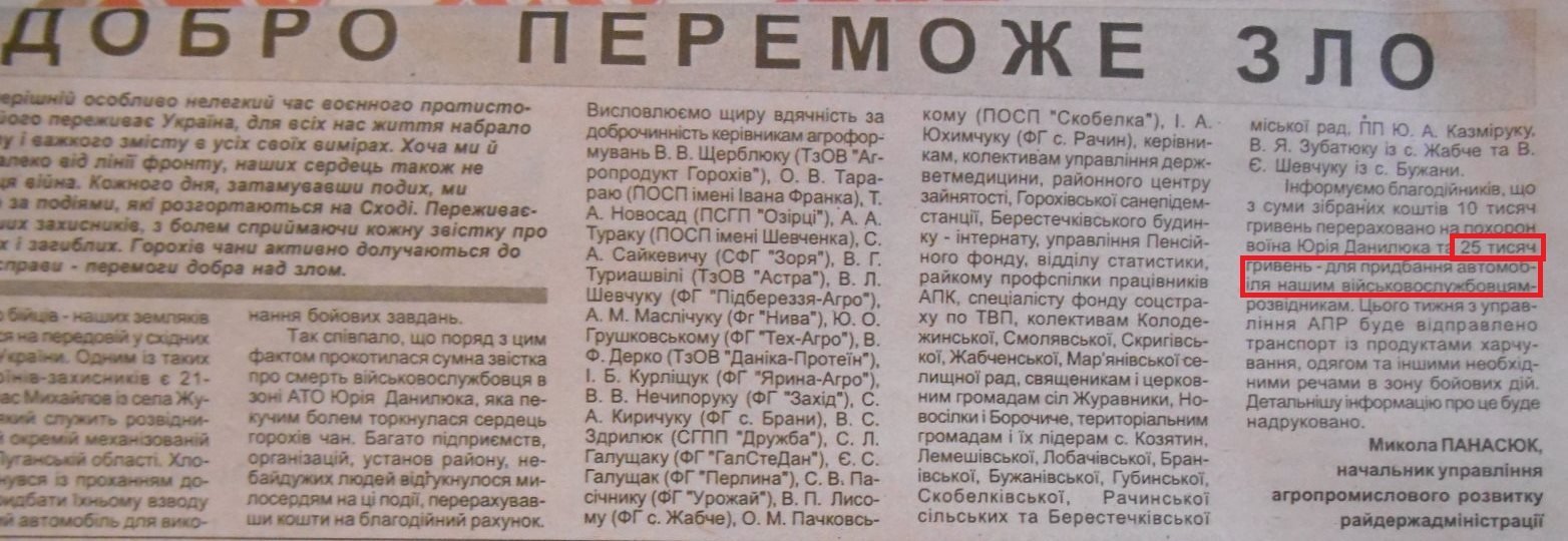 Чому мала місце неузгодженість цього разу, пояснив, власне, Сергій Заєць, котрий і ініціював збір коштів. З його слів, пан Панасюк надав спершу 20 тисяч гривень. Однак цих грошей не вистачало на придбання автомобіля. На суму, якої не вистачало, взяли кредит.