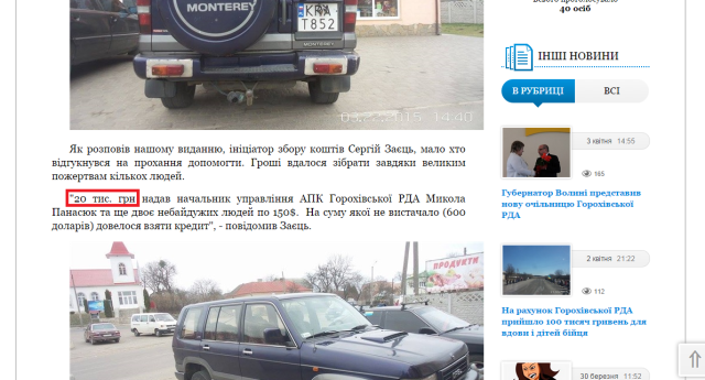 "Обидві вказані суми вірні, - коментує для Інформаційного агентства Волинські Новини Сергій Заєць, - проте з моменту першої публікації і, власне, першої передачі коштів (20 тисяч) до другої пройшло щонайменше 5 днів".