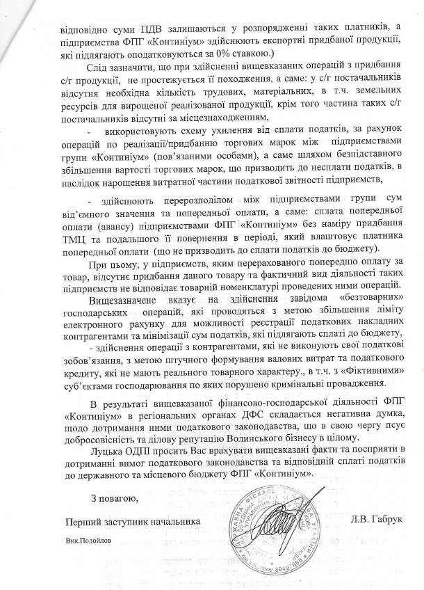 "Луцька ОДПІ ГУ ДФС у Волинській області повідомляє Вас, щодо недобросовісної групи платників, які перебувають на обліку у нашій ДПІ та здійснюють свою діяльність на території Волинської області, а саме підприємств ФПГ «Континіум», за станом на 21.03.2015 року кількість яких складає понад 90 СГД, 55 з яких не декларують податок на прибуток за підсумками 2015 року (є збитковими або відображають нульові показники). При цьому, вказаною групою декларується і від'ємний баланс по податку на додану вартість", - йдеться у листі.