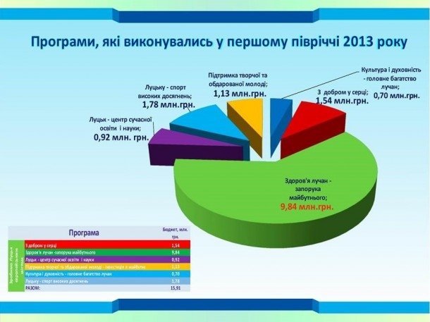 Такими схемами і таблицями благодійний фонд демонстрував види допомог, наданих лучанам, під час презентації, що супроводжувала виступ: