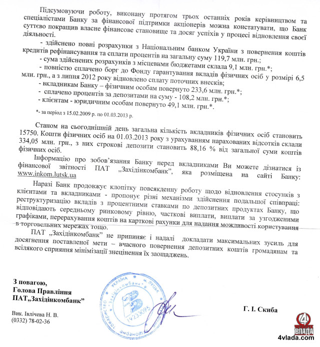 Портал ЧЕТВЕРТА ВЛАДА звернувся до правління ПАТ «Західінкомбанк» із запитом, щоб дізнатися про вжиті заходи та суму заборгованих перед вкладниками коштів.
