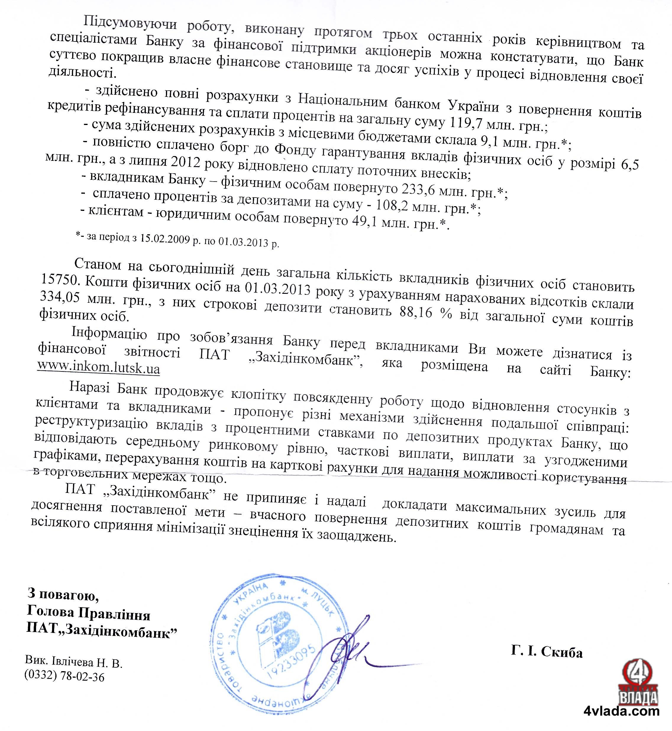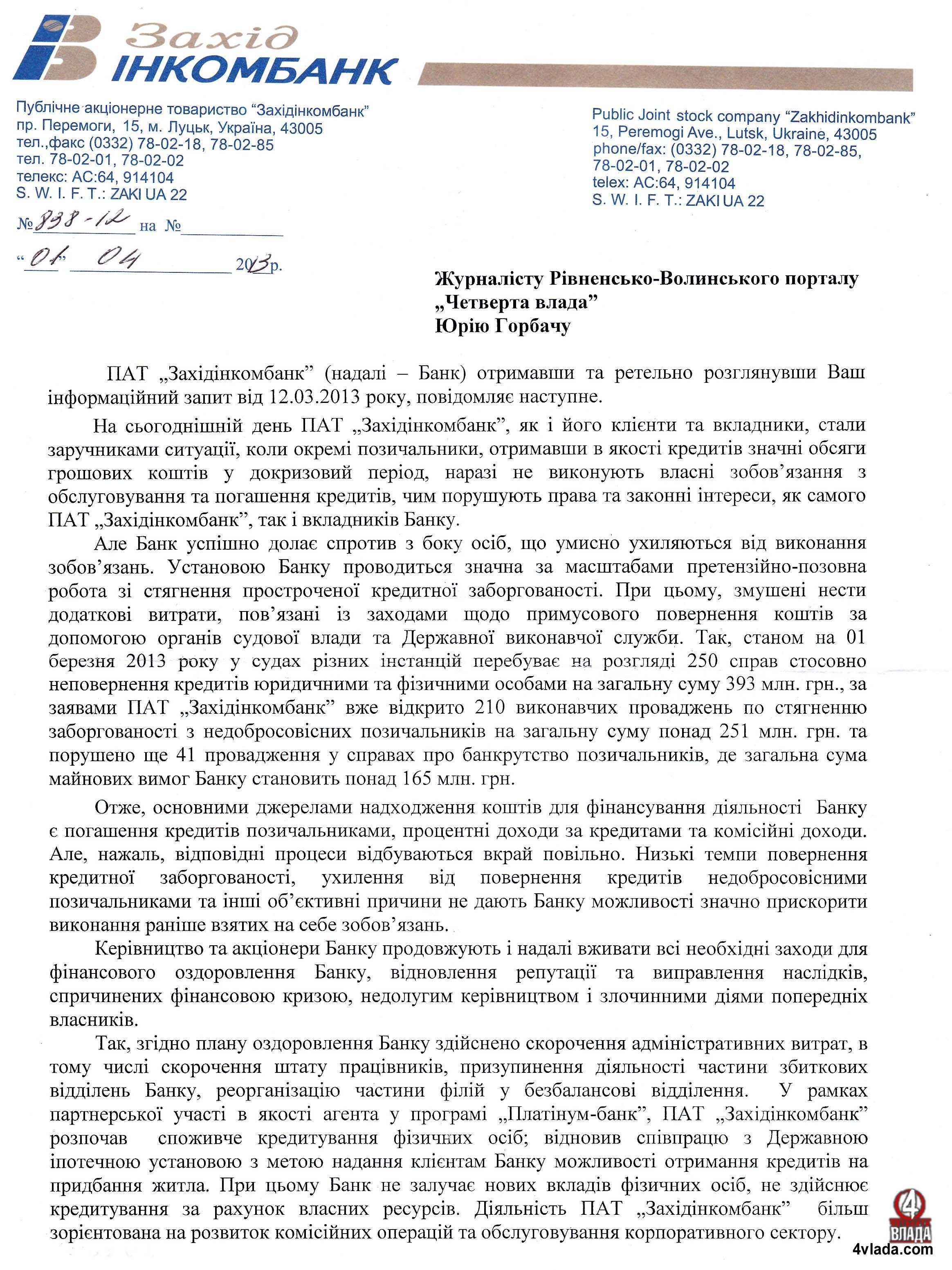 Портал ЧЕТВЕРТА ВЛАДА звернувся до правління ПАТ «Західінкомбанк» із запитом, щоб дізнатися про вжиті заходи та суму заборгованих перед вкладниками коштів.
