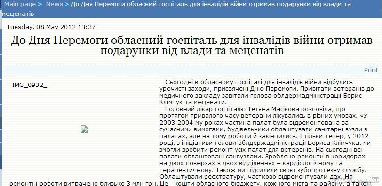 Кажуть, губернатор взяв на контроль це питання та запевнив, що гроші перерахують до святкування чергової річниці Перемоги. Хоча на сайті облдержадміністрації можна знайти публікацію від 8 травня 2012 року під заголовком «До Дня Перемоги обласний госпіталь для інвалідів війни отримав подарунки від влади та меценатів», де міститься інформація про те, що губернатор пообіцяв встановити в госпіталі до кінця 2012 року сучасний рентгенапарат.