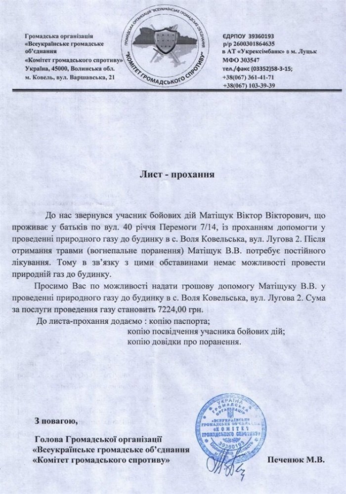 Через витрати на лікування після поранення волинянин не може дозволити собі провести газ. Лист-прохання на громадській раді при ковельському міському голові розповсюджував серед присутніх голова Всеукраїнського об’єднання «Комітет громадського спротиву» Микола Печенюк.