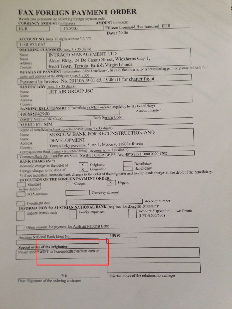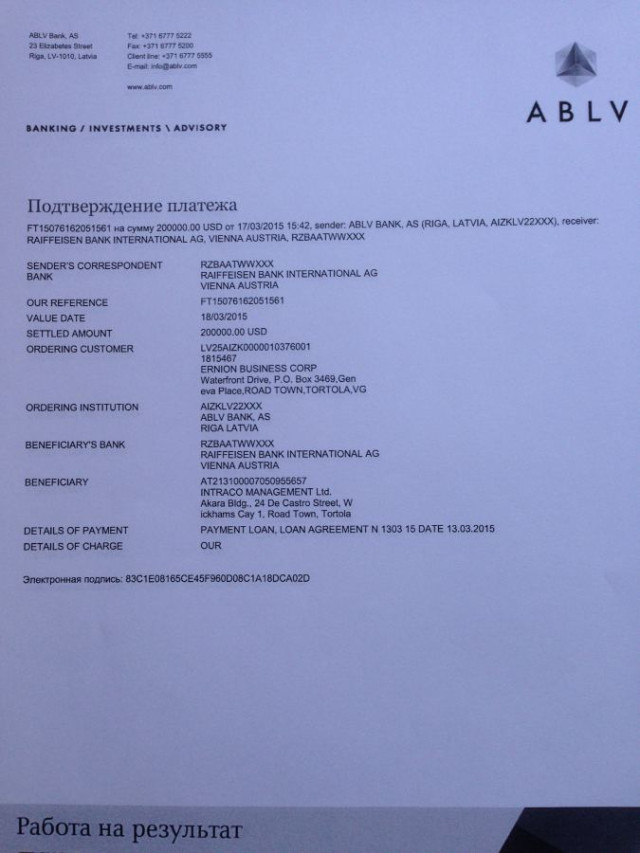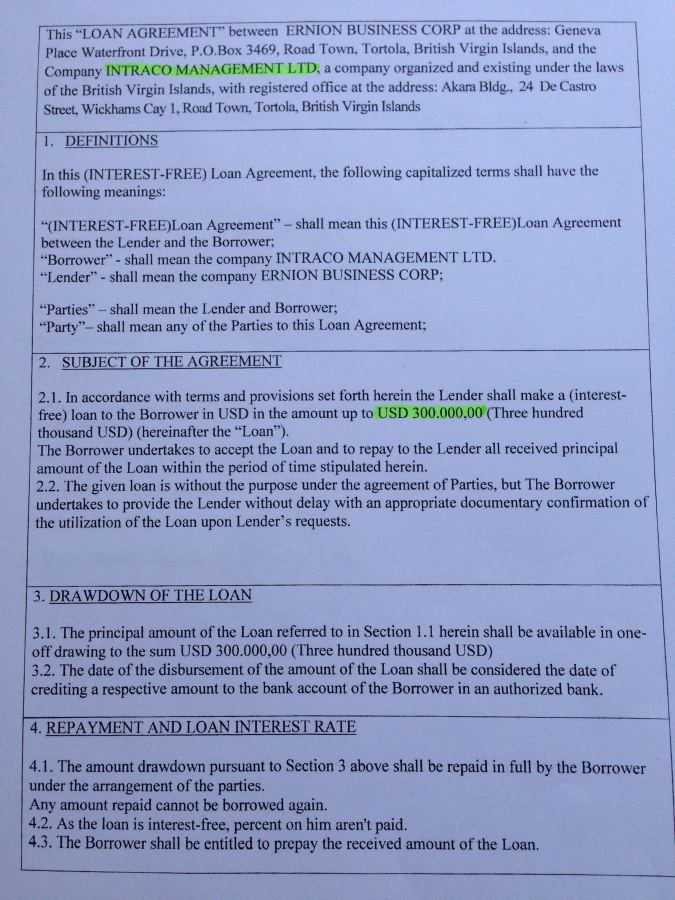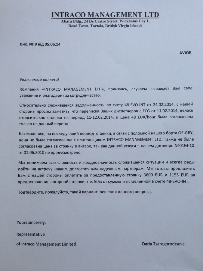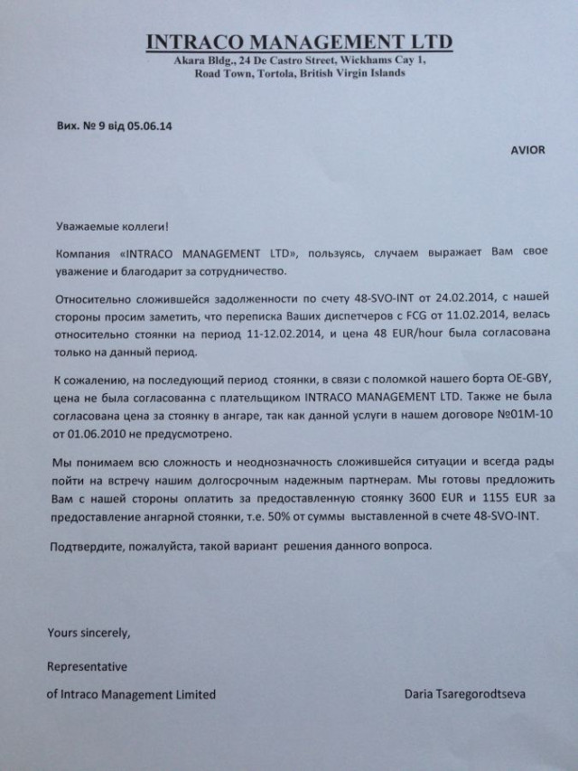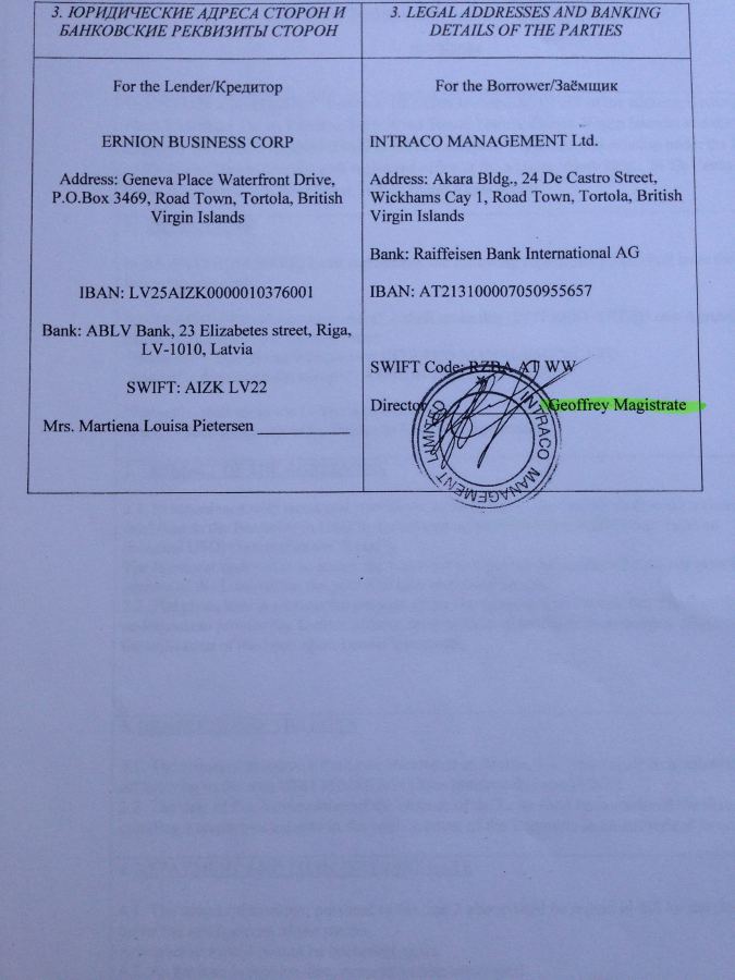 Вже в 2015 році той же офшор знову платив за проживання Дар'ї Кононенко за кордоном.Іншим платіжним дорученням, в 2012 році, компанія Intraco Management LTD перевела офшорній компанії TRESMERE VENTURES LIMITED 70000 американських доларів. У цьому платіжному доручені вказана електронна пошта з прізвищем Кононенко - [email protected], на яку слід відправляти інформацію про переведення. При цьому адреса http://upi.com.ua/ в інтернеті належить сайту компанії «Укрпромінвест», якою володіли спільно Ігор Кононенко і Петро Порошенко. У 2012 році компанію реорганізували.Пізніше, в 2014 - 2015 роках, пошта Кононенка в документах Intraco Management LTD більше не фігурує, проте замість неї вказано схожу електронну адресу, яка також має стосунок до «Укрпромінвесту» [email protected]. Це пошта Дар'ї Царегородцевої, яка є фінансовим директором офшорної компанії Intraco Management LTD.Простежується між Царегородцевою і Кононенко й інший зв'язок. Раніше Дар'я Царегородцева та Ігор Кононенко входили в наглядову раду ПАТ «ПБК«Радомишль», яким до 2011 року володів Петро Порошенко, при цьому Кононенко був головою спостережної ради. У 2011 році Петро Порошенко, згідно з повідомленнями ЗМІ, продав пивзавод «Радомишль» російським бізнесменам, після чого Царегородцева і Кононенко звільнилися за власним бажанням.Є і свіжіші докази зв'язку офшору Intraco Management LTD через Дарину Царегородцеву з президентом Петром Порошенко. Саме цей офшор оплачує витрати президента, пов'язані з авіаперельотами. У розпорядженні редакції також є лист Царегородцевої на фірмовому бланку Intraco Management LTD, в якому компанія обговорює умови оплати за борт OE-GBY, яким літає президент Порошенко.У відкритих джерелах неодноразово вказувалося, що літак Cessna Sovereign з бортовим номером OE-GBY належить Петру Порошенко. Є й документальні підтвердження того, що український президент неодноразово літав цим літаком - це чеки, які отримали з аеропорту «Жуляни».Характерно, що офшор Intraco Management LTD оплачував рейси літака Порошенко в червні 2014 року, коли Петро Олексійович вже був президентом України.Крім того, як свідчать численні договори та платіжні доручення, які є в розпорядженні журналістів, компанія Intraco Management LTD вже в період перебування Порошенка на посаді президента, регулярно здійснювала платежі і отримувала на свої рахунки з рахунків інших офшорних компаній переклади розміром в 100, 200 і навіть 500000 євро. Видання публікує лише деякі з наявних документів, зауваживши, щоредакція має набагато більшу кількість примірників.Перекази грошей іноді здійснювали за договорами позики, як це часто прийнято при проведенні офшорних операцій. Таку схему застосовують зазвичай в тих випадках, коли необхідно легалізувати кошти, отримані нелегальним шляхом. Зазвичай, щоб перевести гроші на рахунок офшорної компанії необхідно вказати призначення платежу, тобто перевести гроші за конкретну послугу або товар. Якщо ж йдеться просто про виведення з країни певної суми готівки (кешу), то тут найчастіше підписують договір позики, згідноз яким гроші віддають компанії ніби в борг і, звичайно, вже не повертають. Саме таким чином часто виводять на офшорні рахунки корупційні гроші українські високопосадовці.Цікаво, що в якості директора Intraco Management LTD вказано певний Джеффрі Маджістрейт (Geoffrey Magistrate).