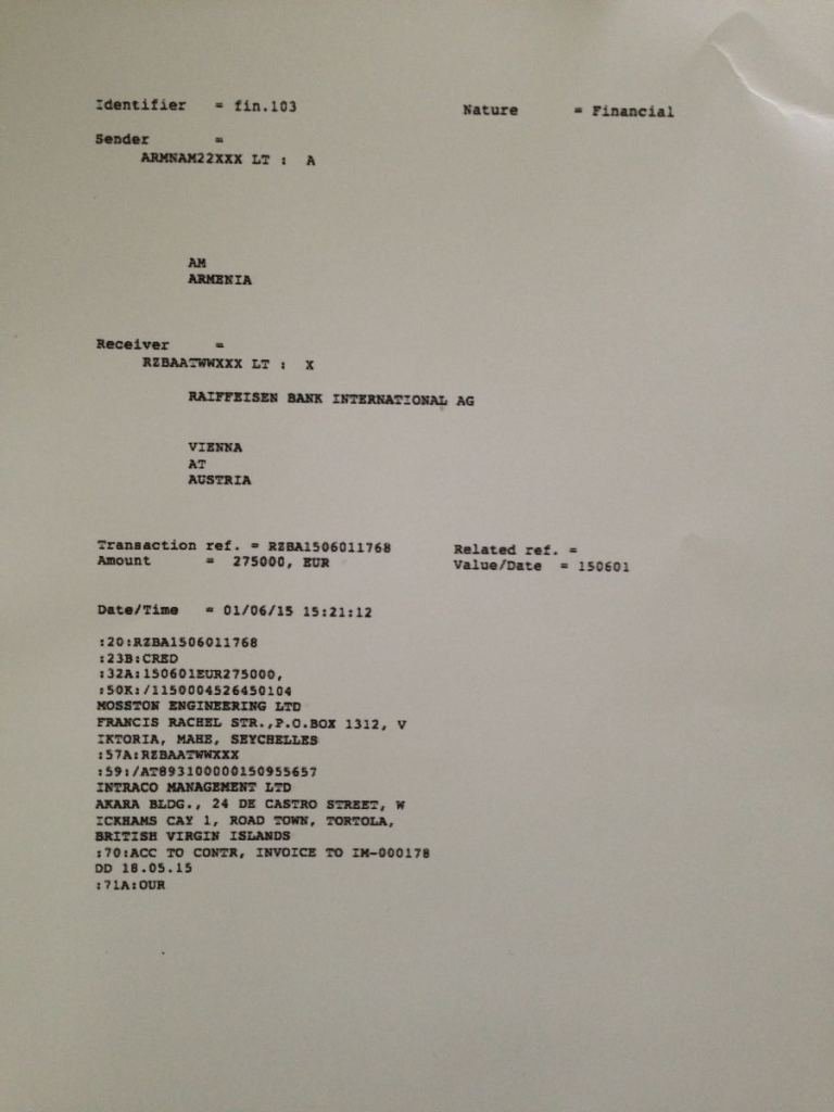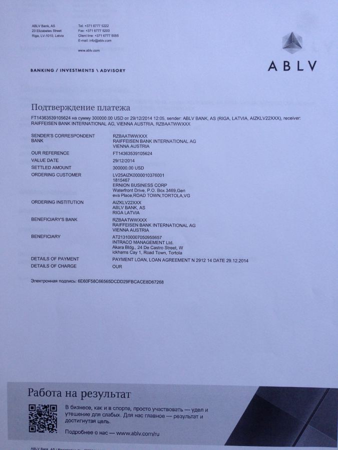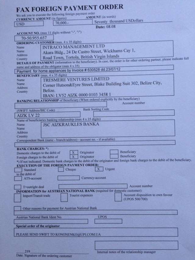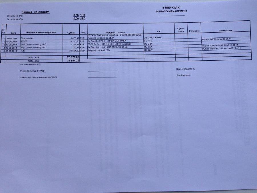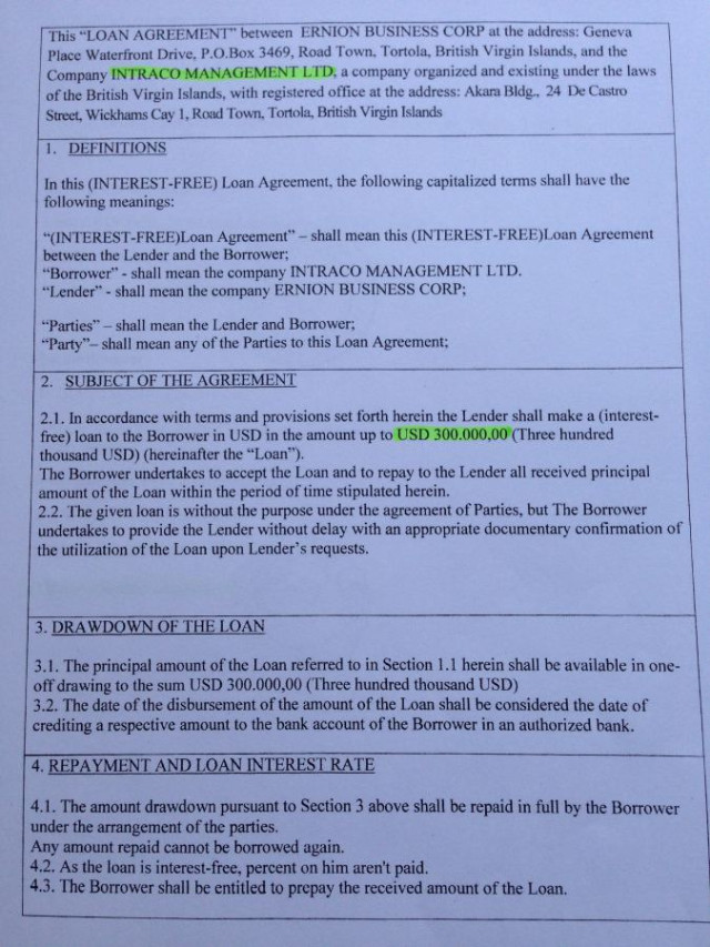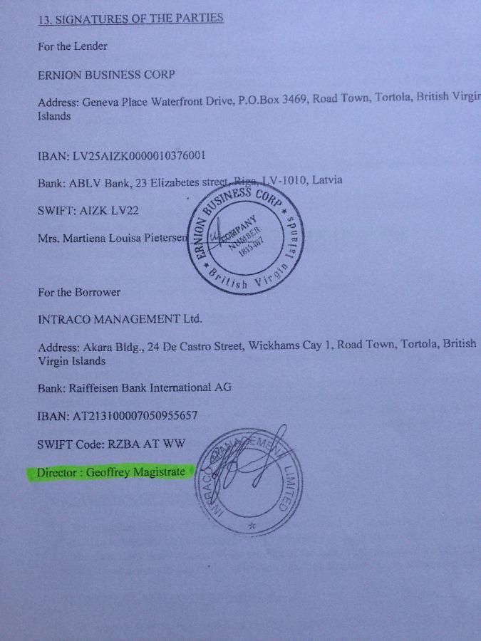 Вже в 2015 році той же офшор знову платив за проживання Дар'ї Кононенко за кордоном.Іншим платіжним дорученням, в 2012 році, компанія Intraco Management LTD перевела офшорній компанії TRESMERE VENTURES LIMITED 70000 американських доларів. У цьому платіжному доручені вказана електронна пошта з прізвищем Кононенко - [email protected], на яку слід відправляти інформацію про переведення. При цьому адреса http://upi.com.ua/ в інтернеті належить сайту компанії «Укрпромінвест», якою володіли спільно Ігор Кононенко і Петро Порошенко. У 2012 році компанію реорганізували.Пізніше, в 2014 - 2015 роках, пошта Кононенка в документах Intraco Management LTD більше не фігурує, проте замість неї вказано схожу електронну адресу, яка також має стосунок до «Укрпромінвесту» [email protected]. Це пошта Дар'ї Царегородцевої, яка є фінансовим директором офшорної компанії Intraco Management LTD.Простежується між Царегородцевою і Кононенко й інший зв'язок. Раніше Дар'я Царегородцева та Ігор Кононенко входили в наглядову раду ПАТ «ПБК«Радомишль», яким до 2011 року володів Петро Порошенко, при цьому Кононенко був головою спостережної ради. У 2011 році Петро Порошенко, згідно з повідомленнями ЗМІ, продав пивзавод «Радомишль» російським бізнесменам, після чого Царегородцева і Кононенко звільнилися за власним бажанням.Є і свіжіші докази зв'язку офшору Intraco Management LTD через Дарину Царегородцеву з президентом Петром Порошенко. Саме цей офшор оплачує витрати президента, пов'язані з авіаперельотами. У розпорядженні редакції також є лист Царегородцевої на фірмовому бланку Intraco Management LTD, в якому компанія обговорює умови оплати за борт OE-GBY, яким літає президент Порошенко.У відкритих джерелах неодноразово вказувалося, що літак Cessna Sovereign з бортовим номером OE-GBY належить Петру Порошенко. Є й документальні підтвердження того, що український президент неодноразово літав цим літаком - це чеки, які отримали з аеропорту «Жуляни».Характерно, що офшор Intraco Management LTD оплачував рейси літака Порошенко в червні 2014 року, коли Петро Олексійович вже був президентом України.Крім того, як свідчать численні договори та платіжні доручення, які є в розпорядженні журналістів, компанія Intraco Management LTD вже в період перебування Порошенка на посаді президента, регулярно здійснювала платежі і отримувала на свої рахунки з рахунків інших офшорних компаній переклади розміром в 100, 200 і навіть 500000 євро. Видання публікує лише деякі з наявних документів, зауваживши, щоредакція має набагато більшу кількість примірників.Перекази грошей іноді здійснювали за договорами позики, як це часто прийнято при проведенні офшорних операцій. Таку схему застосовують зазвичай в тих випадках, коли необхідно легалізувати кошти, отримані нелегальним шляхом. Зазвичай, щоб перевести гроші на рахунок офшорної компанії необхідно вказати призначення платежу, тобто перевести гроші за конкретну послугу або товар. Якщо ж йдеться просто про виведення з країни певної суми готівки (кешу), то тут найчастіше підписують договір позики, згідноз яким гроші віддають компанії ніби в борг і, звичайно, вже не повертають. Саме таким чином часто виводять на офшорні рахунки корупційні гроші українські високопосадовці.Цікаво, що в якості директора Intraco Management LTD вказано певний Джеффрі Маджістрейт (Geoffrey Magistrate).