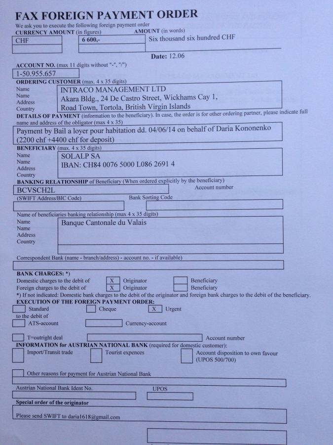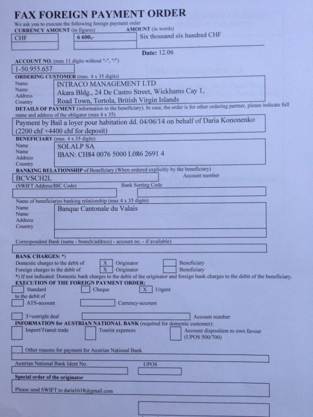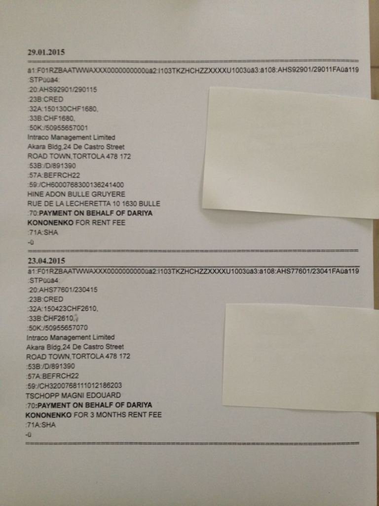 У 2012 році Intraco Management LTD перерахував 6600 швейцарських франків на рахунок готелю SOLALP SA у Швейцарії. У деталях платежу зазначено, що сума внесена за проживання Дар'ї Кононенко.