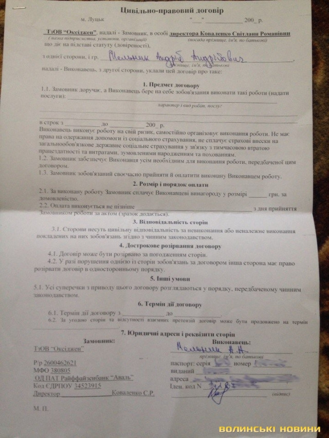 «В мене був підписаний цивільно-трудовий договір, здані копії паспорту та ідентифікаційного коду, але він в них лежить уже не з моїм, а з підробленим підписом. Його робили для «відмазки», на той випадок, якщо нагряне перевірка», - розповідає юнак.