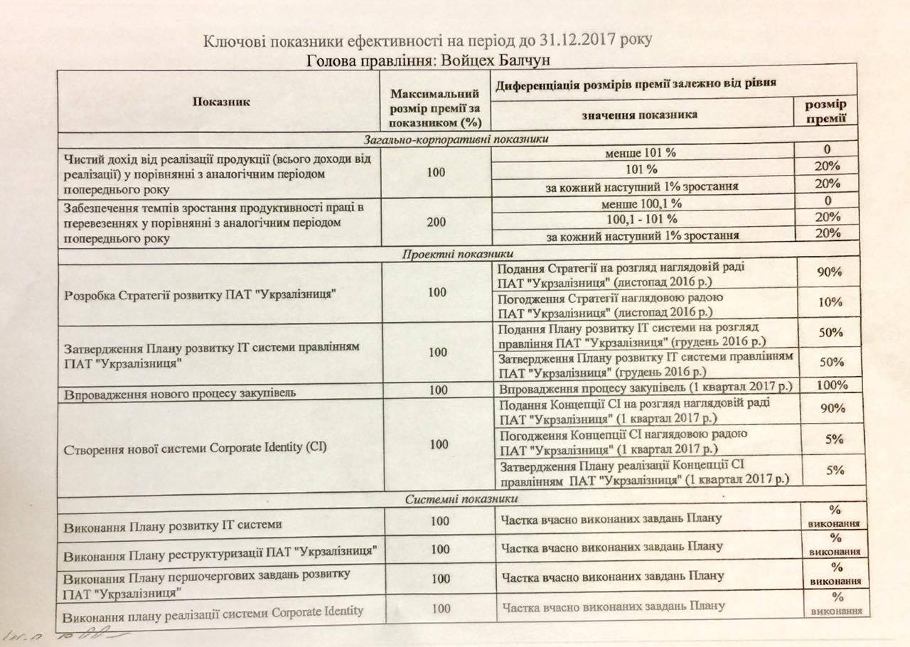 Члени правління “Укрзалізниці” створили графік-схему визначення обсягу премій для голови та членів правління за загально-корпоративними, системними та проектними показниками ефективності роботи до кінця 2017 року.