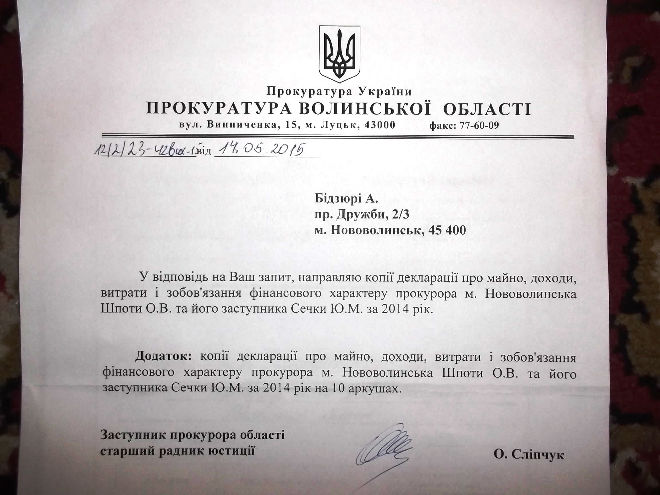 Інформацію про прибутки прокурорів, з зі слів журналіста, надав йомузаступник обласного прокурора Олександр Сліпчук, (колишній міський прокурор Нововолинська).