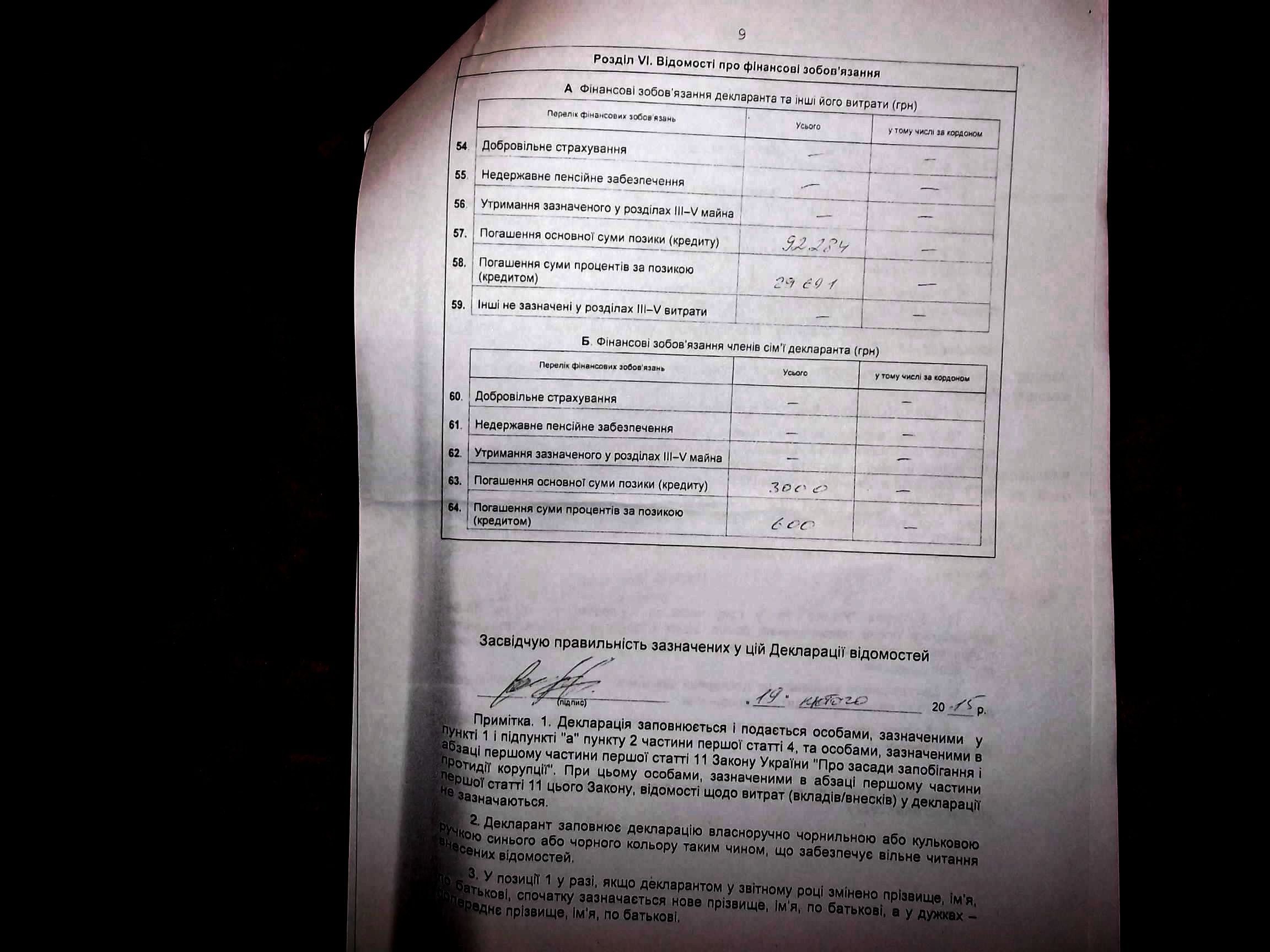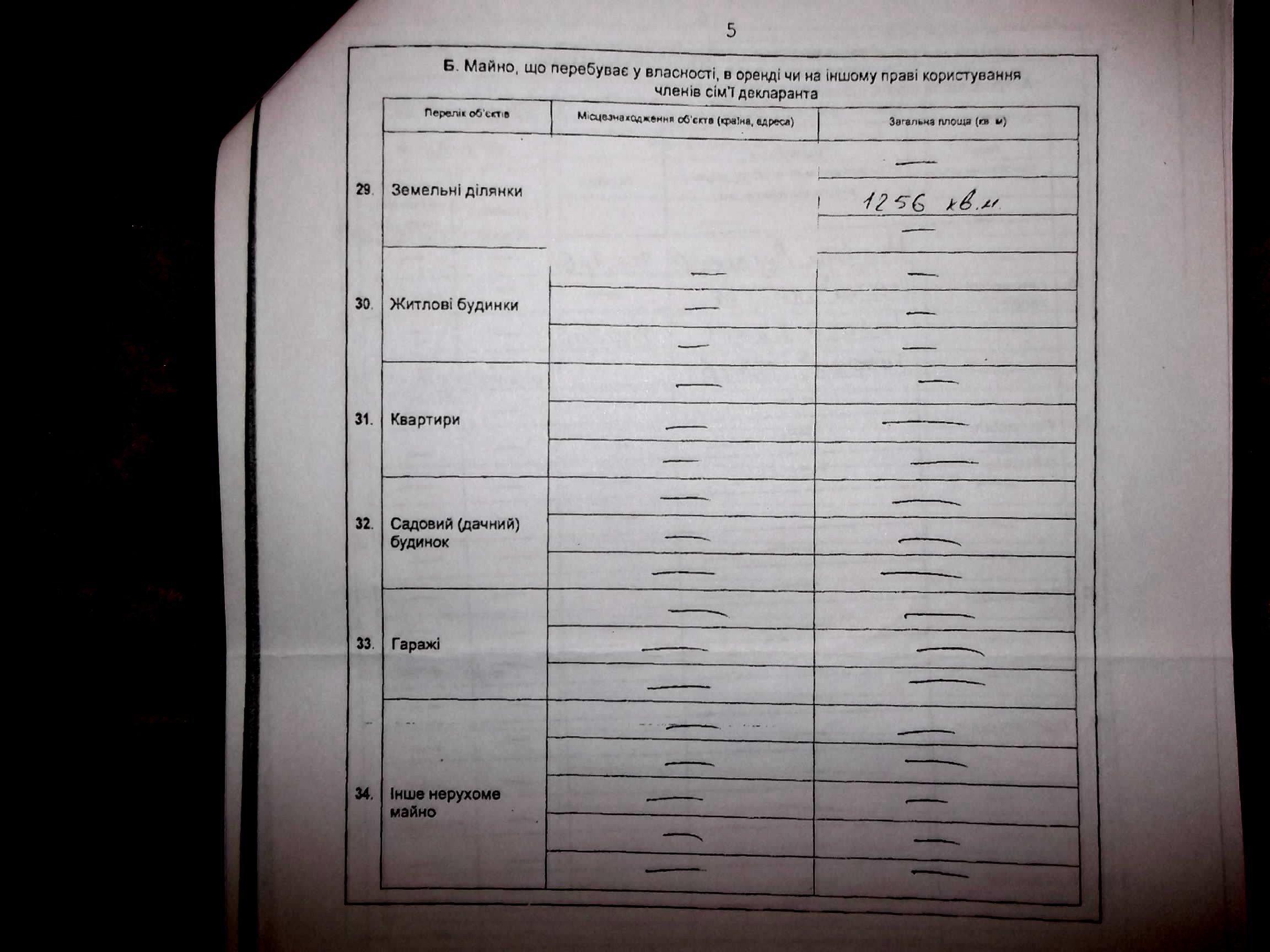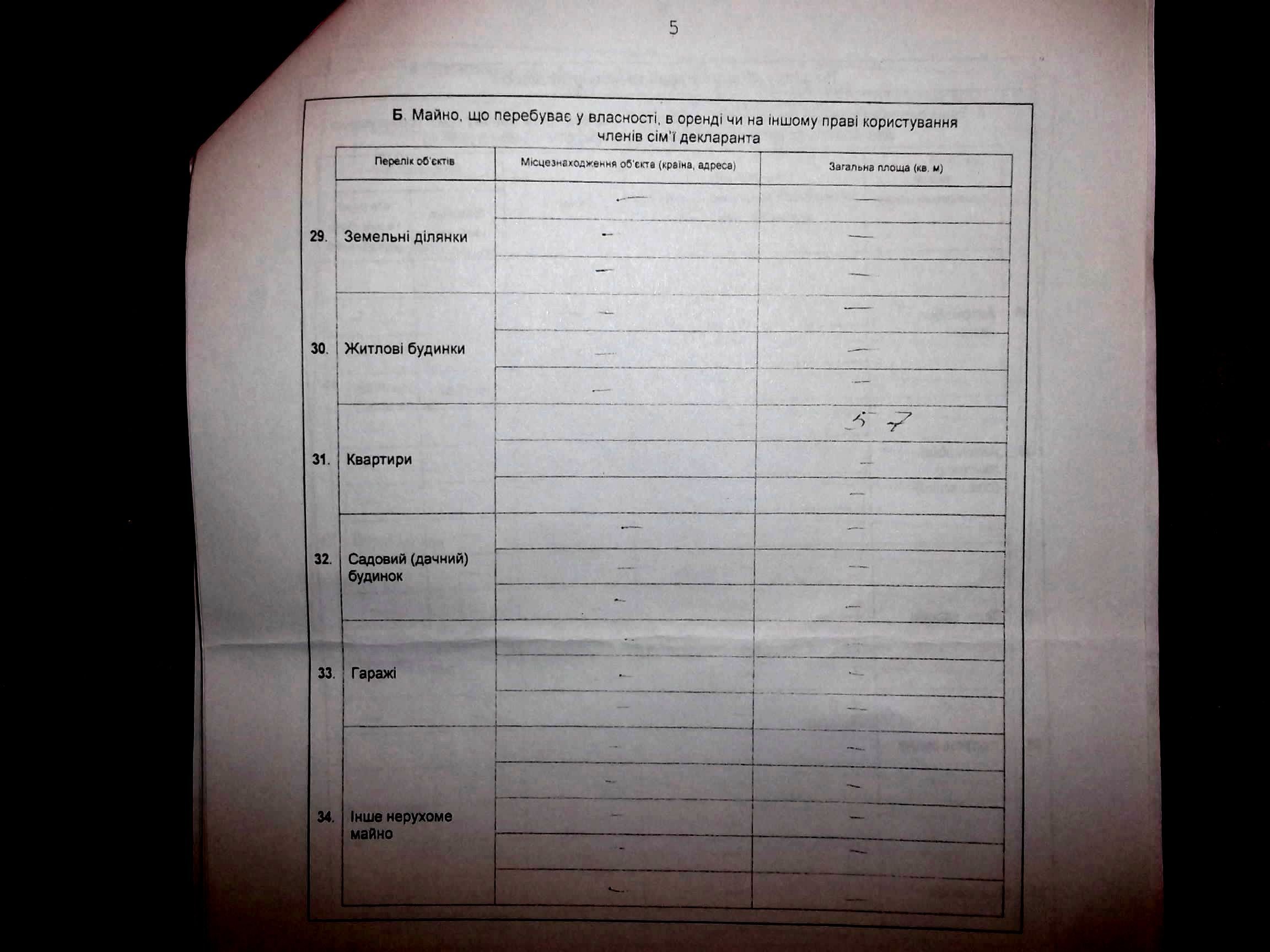 Земельна ділянка та ж сама – 12,56 сотих гектара. Квартира чи будинок (не вказано) - 94 метри квадратних, як і минулоріч. Місцезнаходження житла – невідоме. Вкладів у банках про чорний день – 0. Витрат на обслуговування вищевказаного майна - 0.
