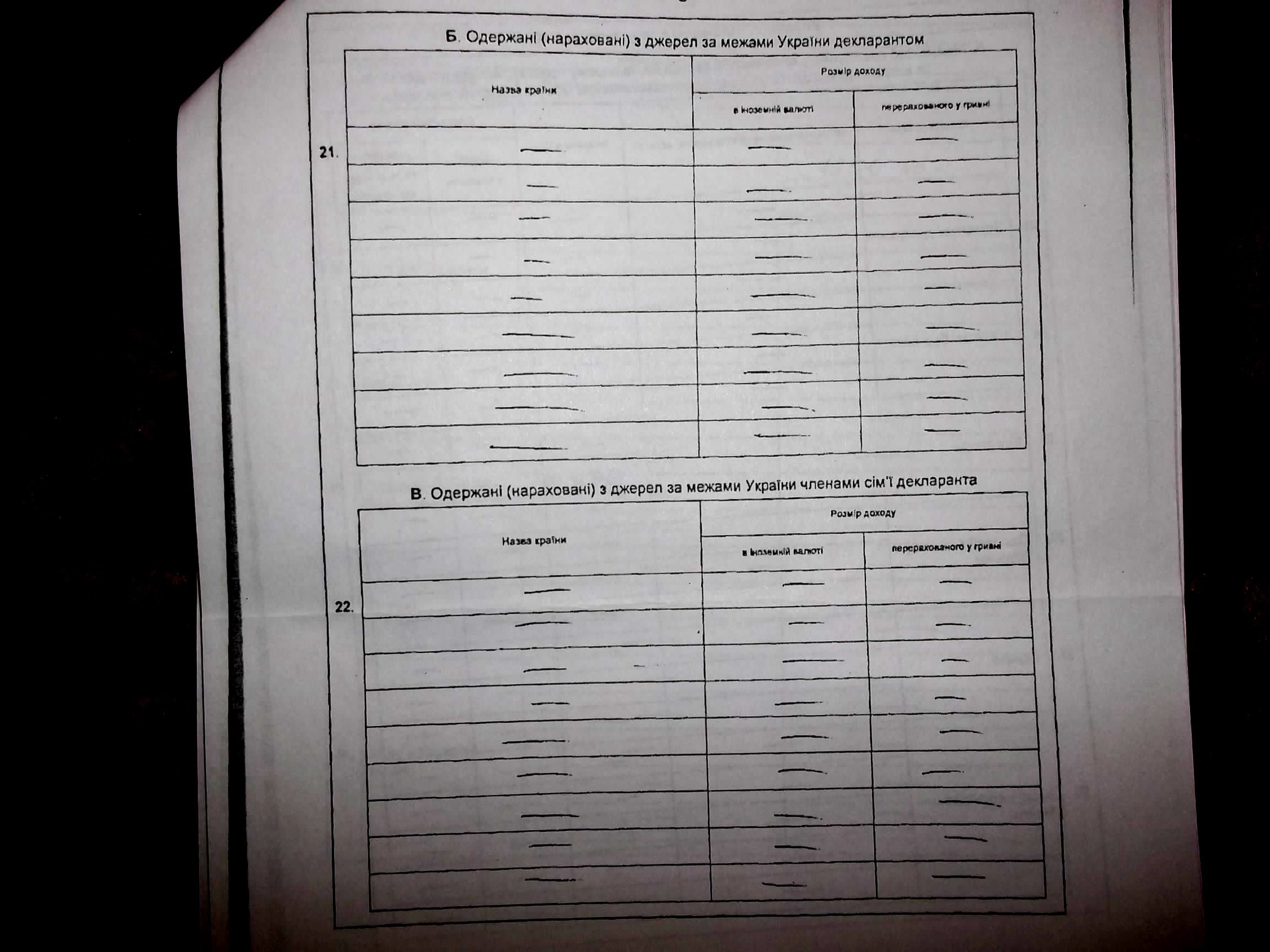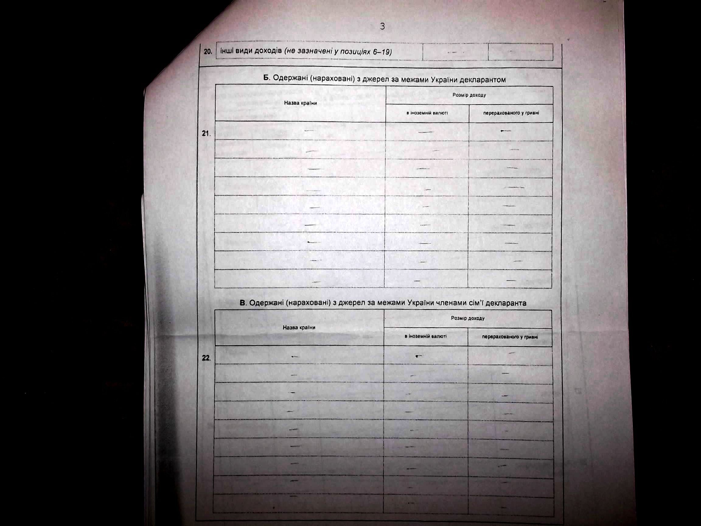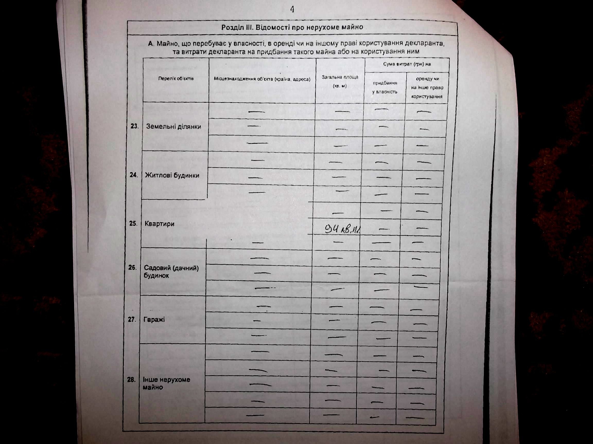 Земельна ділянка та ж сама – 12,56 сотих гектара. Квартира чи будинок (не вказано) - 94 метри квадратних, як і минулоріч. Місцезнаходження житла – невідоме. Вкладів у банках про чорний день – 0. Витрат на обслуговування вищевказаного майна - 0.