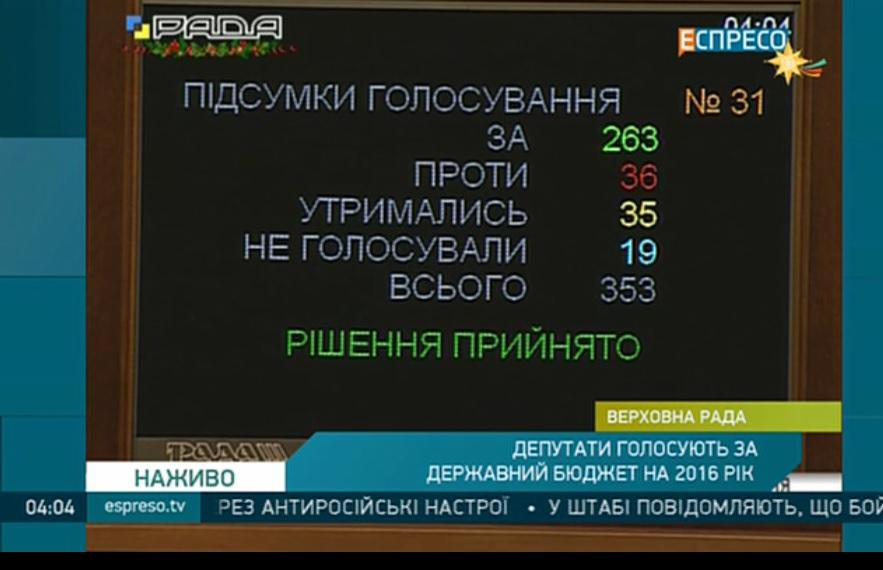 Верховна Рада ухвалила урядовий проект Держбюджету-2016. За відповідне рішення проголосували 263 народних депутатів, повідомляє УНН.