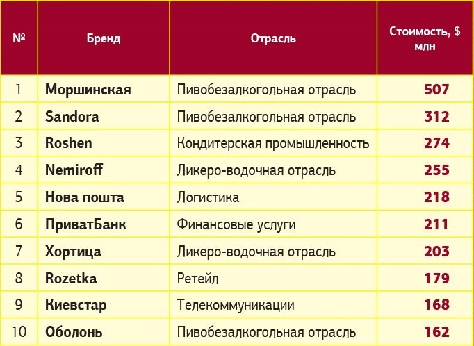 На першому місці розташований бренд Моршинська, вартість якого оцінили в $507 млн. Другий рядок рейтингу посів ще один представник пивобезалкогольної галузі, компанія Sandora, її вартість оцінюють в $312 млн. Замикає трійку найбагатших торгових марок в Україні Roshen ($274 млн).