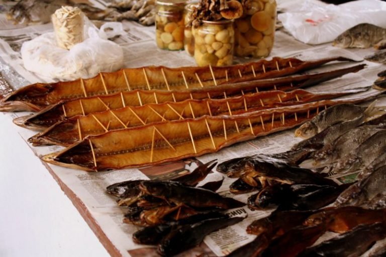 Що можна купити: різні види риб, у тому числі вугрів і раків, зроблених за різними рецептами, у копченому і в’яленому вигляді.