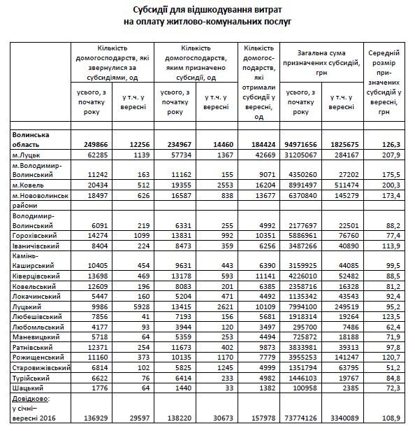 Середній розмір призначеної субсидії для відшкодування витрат на оплату житлово-комунальних послуг на одне домогосподарство області у вересні становив 126,3 гривні. При цьому майже 32 тисячі волинян отримали субсидії готівкою.