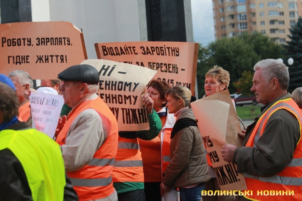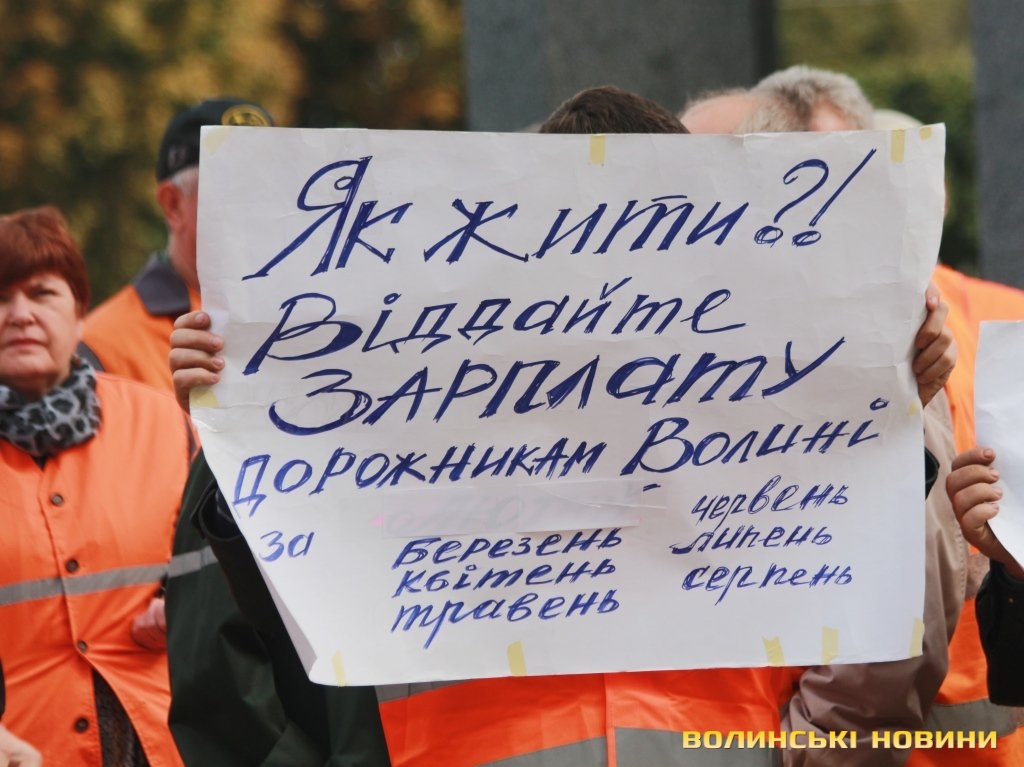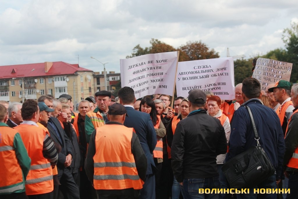 Десятки працівників ДП «Волинський облавтодор» та його філій прибули на Київський майдан з плакатами з написами: «Як жити? Віддайте зарплату дорожникам Волині», «Ні - дводенному-триденному робочому тижню», «роботу, зарплату, гідне життя» та іншими.