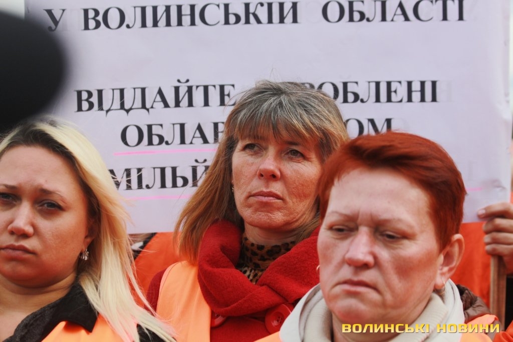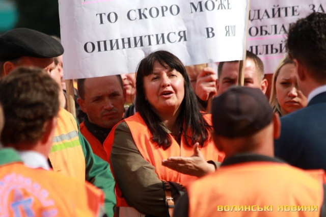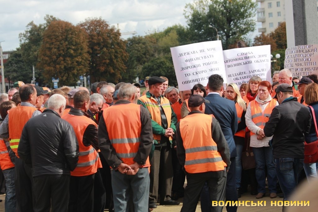 Пікет під стінами облдержадміністрації відбувся після перекриття автомагістралей працівниками ДП «Волинський облавтодор», які вимагають виплатити їм заробітну плату.