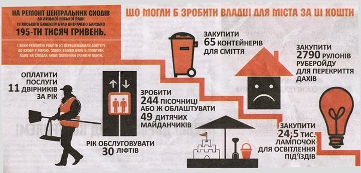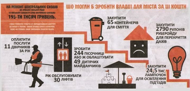 У газеті пишуть, що на ремонт сходів Луцької міської ради із місцевого бюджету витратили 195 тисяч гривень. В інфографіці порівнюють, що могли б зробити в місті за ті ж кошти.