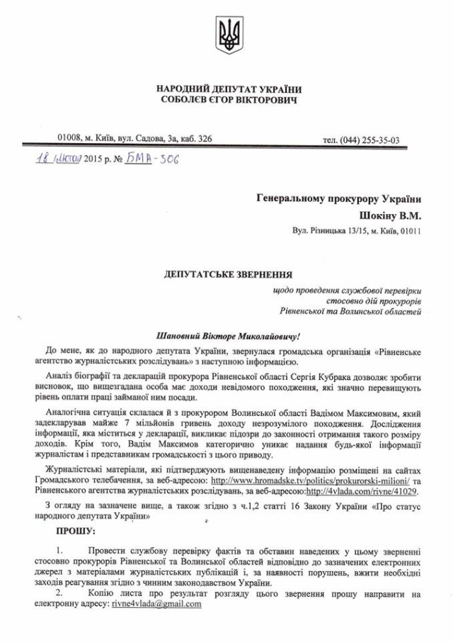 Народний депутат від фракції «Самопоміч» Єгор Соболєв звернувся до Генерального прокурора Віктора Шокіна з ініціативою перевірити інформацію від журналістів про статки прокурора Волинської області Вадима Максимова.