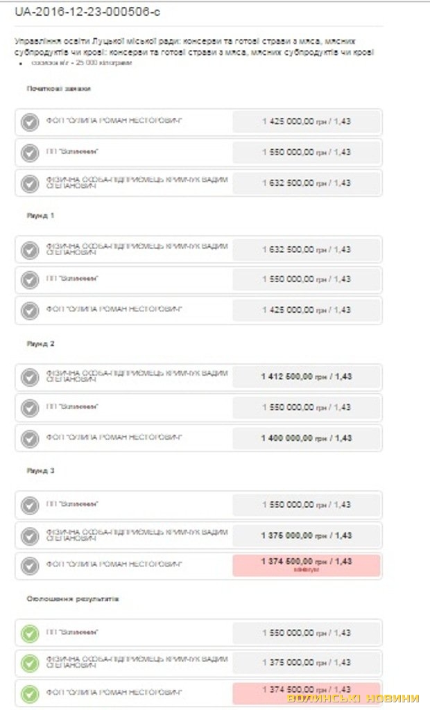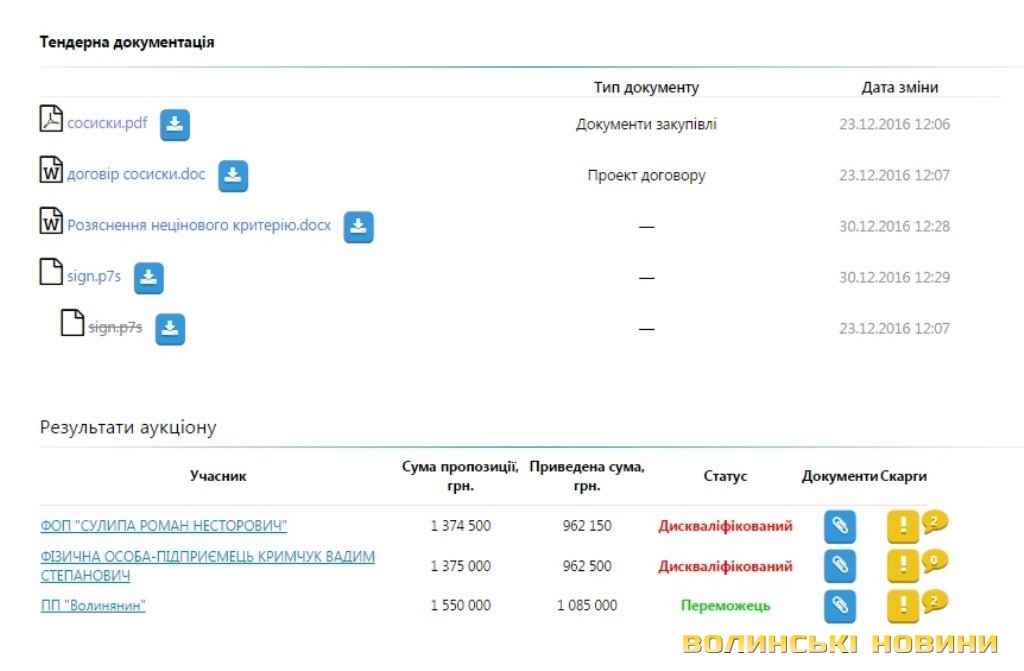 На цю ж закупівлю подавали заявки три учасники: ПП «Волинянин», ФОП Сулипа Роман Несторович та ФОП Кримчук Вадим Степанович. Під час аукціону тільки ПП Волинянин» не знижувало свою цінову пропозицію і залишилося з тією, яку подавало на початку: 1,550 мільйона гривень.Двох з них, які надали нижчі цінові пропозиції, аніж ПП «Волинянин», дискваліфікували.Зокрема, ФОП Сулипа Роман Несторович отримав відмову тендерного комітету через те, що не надані копії про держреєстрацію учасника на ринку як оператора харчових продуктів, у складі пропозиції відсутній дозвіл на складські приміщення та не надані документи про якість.