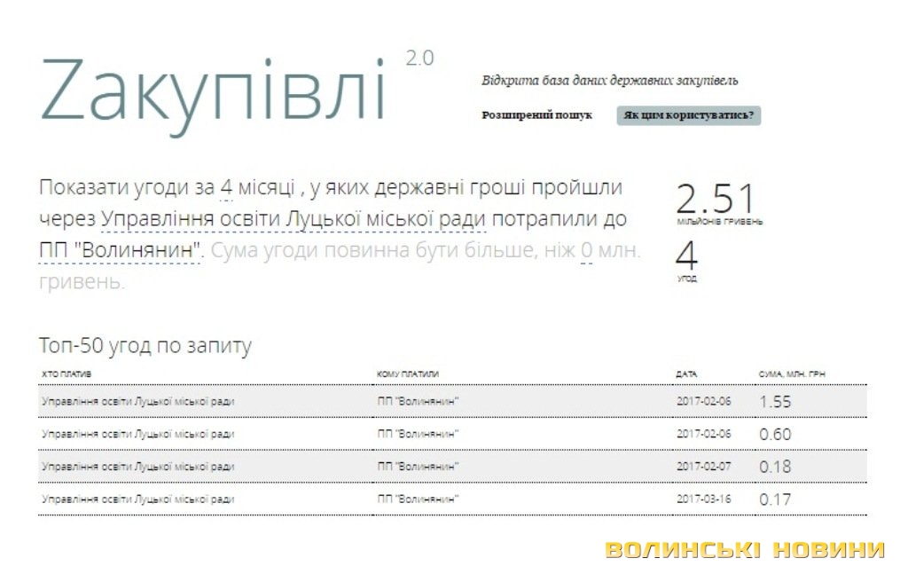 А 20 лютого 2015 року за результатами процедури відкритих торгів (оголошення № 070887, ВДЗ № 204 від 03.03.2015 р.) управління освіти виконавчого комітету Ковельської міської ради уклало угоду з приватним підприємством «Волинянин» на закупівлю олії рафінованої. Вартість складає 175 871,80 грн. (з ПДВ), пише видання Район.Ковель.