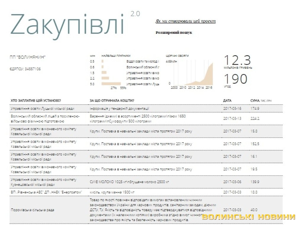 Відповідно до даних сервісу z.teksty.org.ua, з 2014 року це підприємство уклало 190 угод на постачання продуктів харчування від бюджетних установ Волинської та Рівненської областей на загальну суму 12,3 мільйона гривень.Лише цього року управління освіти Луцької міської ради уклало 4 угоди з цим же підприємством на суму 2,5 мільйона гривень. Найбільша закупівля, яку виграло ПП «Волинянин» – постачання 25 тис. кг сосисок на суму 1,550 мільйона гривень у луцькі садочки.