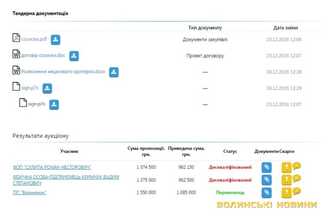 На цю ж закупівлю подавали заявки три учасники: ПП «Волинянин», ФОП Сулипа Роман Несторович та ФОП Кримчук Вадим Степанович. Під час аукціону тільки ПП Волинянин» не знижувало свою цінову пропозицію і залишилося з тією, яку подавало на початку: 1,550 мільйона гривень.Двох з них, які надали нижчі цінові пропозиції, аніж ПП «Волинянин», дискваліфікували.Зокрема, ФОП Сулипа Роман Несторович отримав відмову тендерного комітету через те, що не надані копії про держреєстрацію учасника на ринку як оператора харчових продуктів, у складі пропозиції відсутній дозвіл на складські приміщення та не надані документи про якість. ФОП Кримчук Вадим Степанович отримав аргументацію відмови, що в копії договору з виробником не зазачено предмет закупівлі і не надані копії про держреєстрацію учасника на ринку як оператора харчових продуктів тваринного походження.Дискваліфіковані учасники скарг не подали, очевидно, з таким рішенням тендерного комітету погодилися.