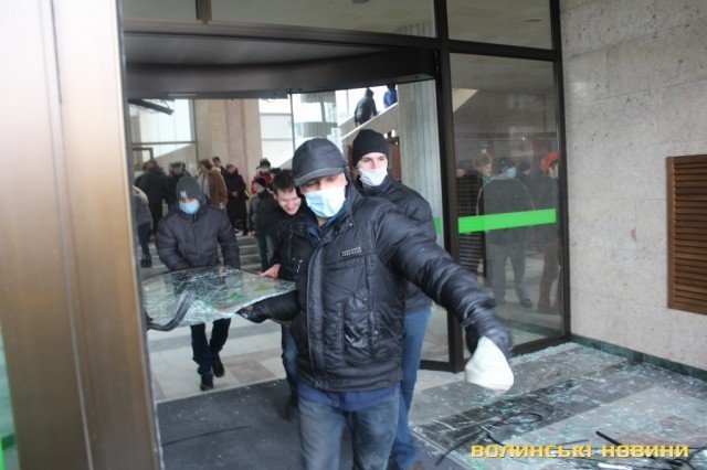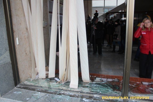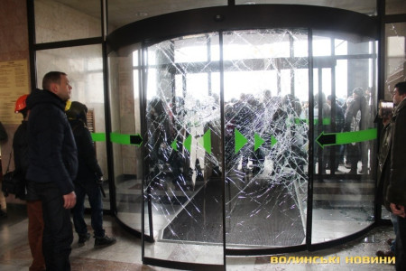 Нагадаємо, 19-го лютого, 2014-го року десятки агресивно налаштованих юнаків, не дочекавшись поки їх пропустять всередину, почали бити скляні вхідні двері, а згодом декілька вікон ліворуч від входу.