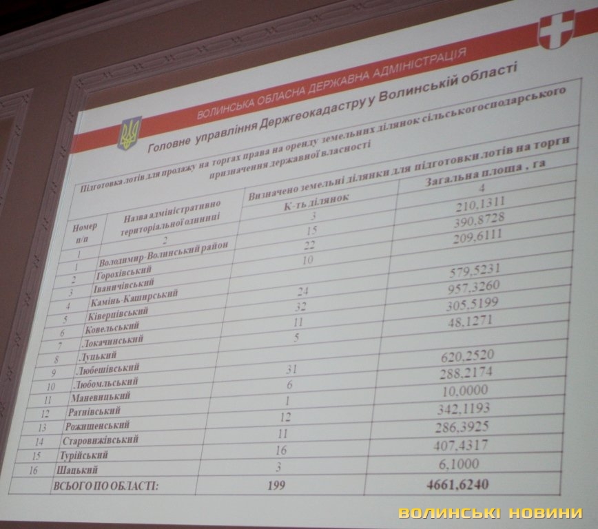 Як повідомив начальник Головного управління Держгеокадастру в області Василь Василенко, впродовж першого півріччя 2015 року відбулося 20 аукціонів з продажу 35 земельних ділянок сільськогосподарського та несільськогосподарського призначення комунальної власності та прав оренди на них загальною площею 87,25 гектара (найбільше – у Турійському (6 ділянок), Горохівському (5), Ківерцівському районах (5) та Нововолинську (6)).