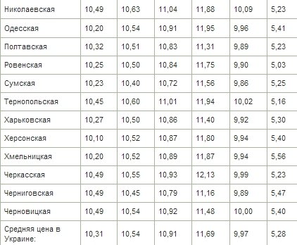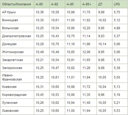 Максимальна ціна А-95 - у Донецькій області - 11,16 гривні за літр; мінімальна у Сумській області - 10,72 гривні за літр.