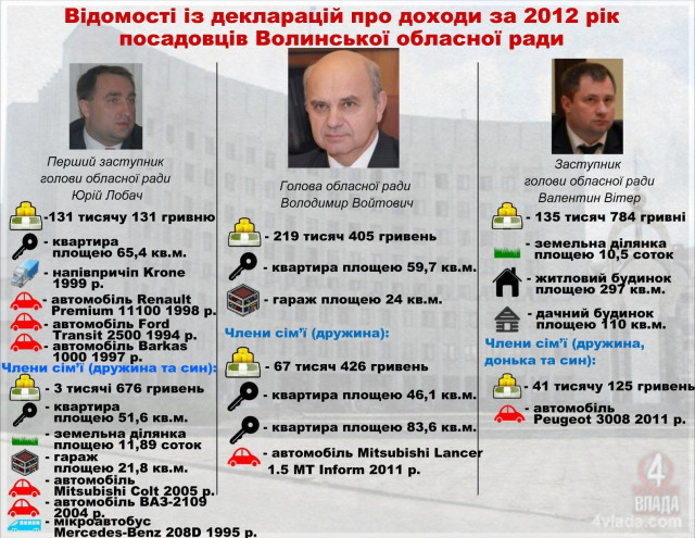 Голова обласної ради у 2012 році заробив на 4 тисячі менше, ніж у попередньому році, а його перший заступник разом із членами сім´ї має 6 автомобілів і напівпричіп, - інформує Четверта влада.
