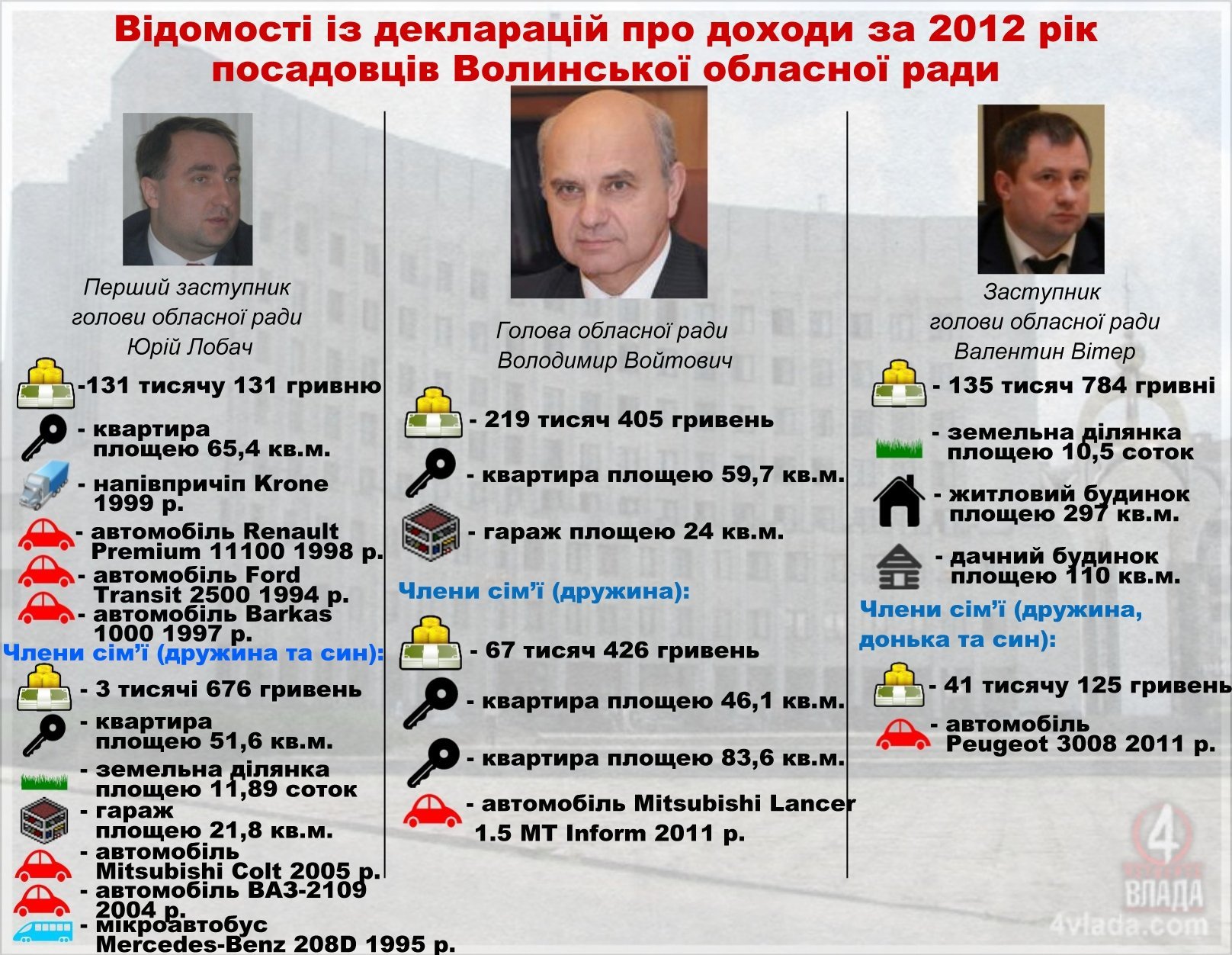 Так, Володимир Войтович у 2012-му заробив 219 тисяч 405 гривень сукупного доходу. У цю суму ввійшли 191 тисячі 153 гривні заробітної плати та 28 тисяч 252 гривні інших видів доходів. Серед членів сім’ї посадовець відзначив дружину. Вона у минулому році заробила 67 тисяч 426 гривень, із них 54 тисячі 243 гривні відзначені як заробітна плата, а 13 тисяч 183 – як інші види доходів.