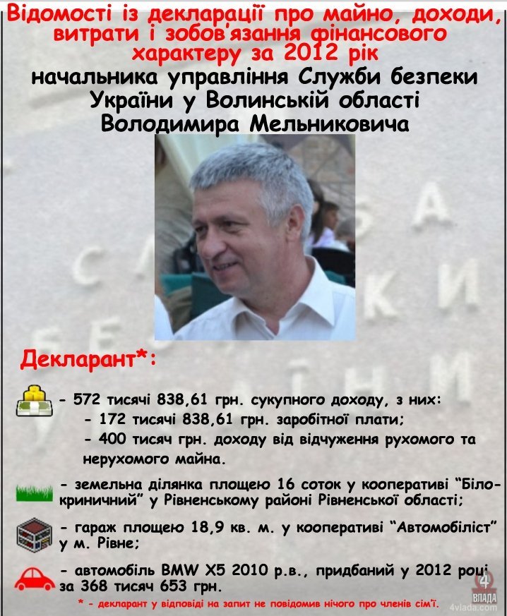 Начальник управління Служби безпеки України у Волинській області Володимир Мельникович відмовився надати копію своєї декларації про майно, доходи і зобов’язання фінансового характеру за 2012 рік журналістам. Однак, «слідуючи засадам забезпечення прозорості та відкритості», повідомив відомості із неї, - інформує Четверта влада.