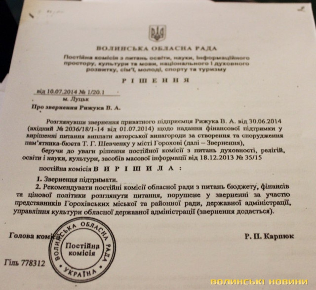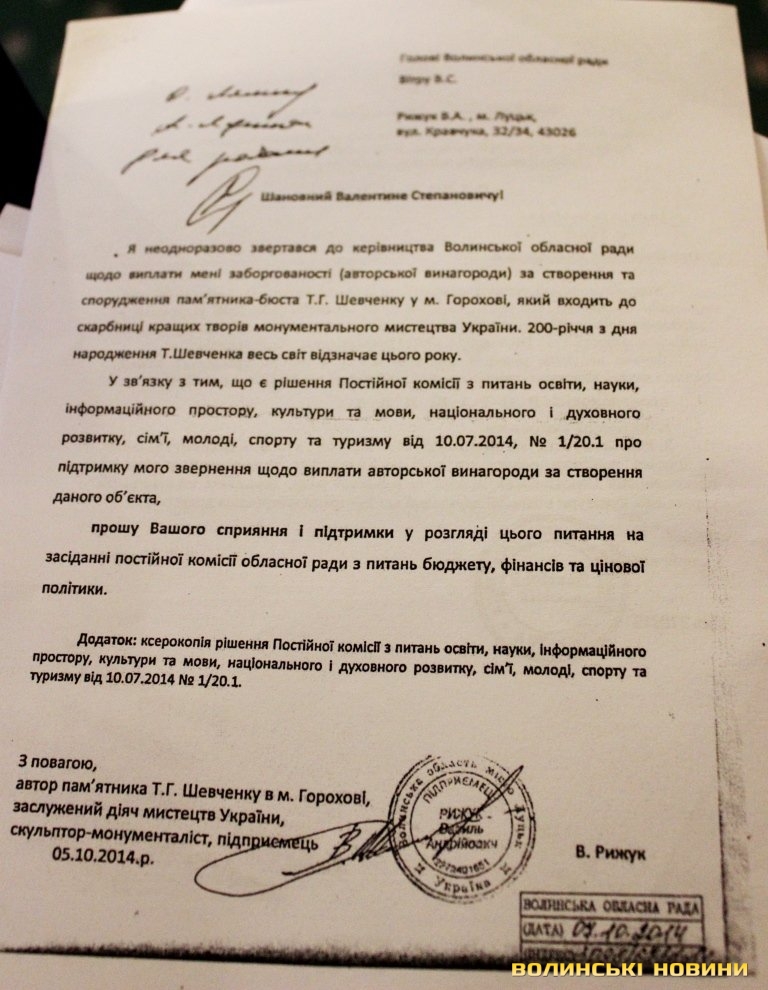 Скульптор звернувся до голови облради із проханням посприяти у вирішенні питання із виплатою винагороди за створення та спорудження пам’ятника-бюста Тарасу Шевченку у Горохові, який, зі слів митця? «входить до скарбниці кращих творів монументального мистецтва України». Василь Рижук наголосив, що цьогоріч увесь світ відзначає 200-річчя від дня народження Тараса Шевченка, до того ж, звернення скульптора підтримала постійна комісія з питань освіти, науки, інформаційного простору, культури та мови, національного і духовного розвитку, сім’ї, молоді, спорту та туризму. Василь Рижук зауважив, що впродовж років не може отримати свій законний гонорар.