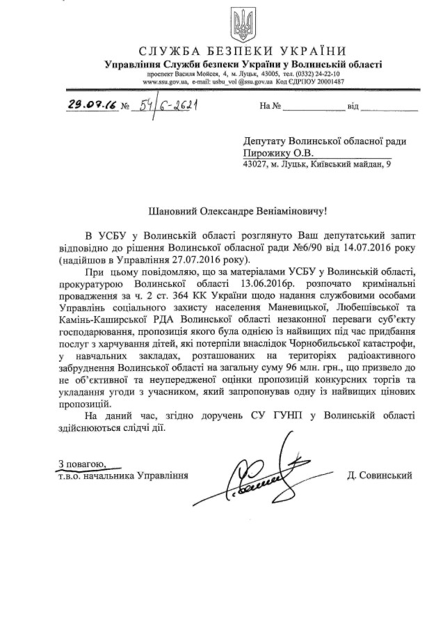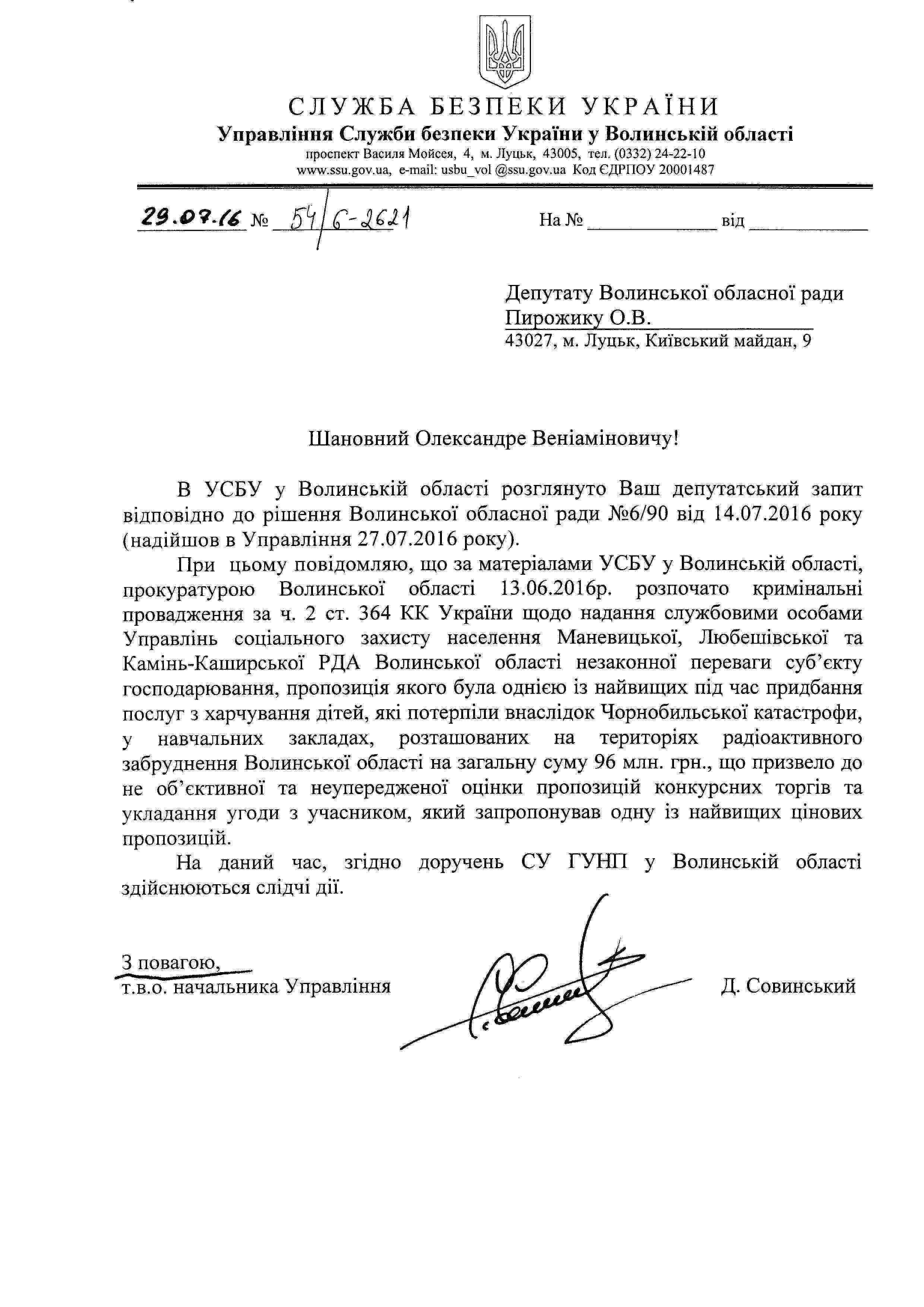 З відповіді на депутатський запит, що надійшла з УСБУ у Волинській області, вбачається, що викладені у депутатському запиті відомості знайшли підтвердження. За цими фактами відкриті та розслідуються кримінальні провадження за частиною 2 статті 364 КК України.