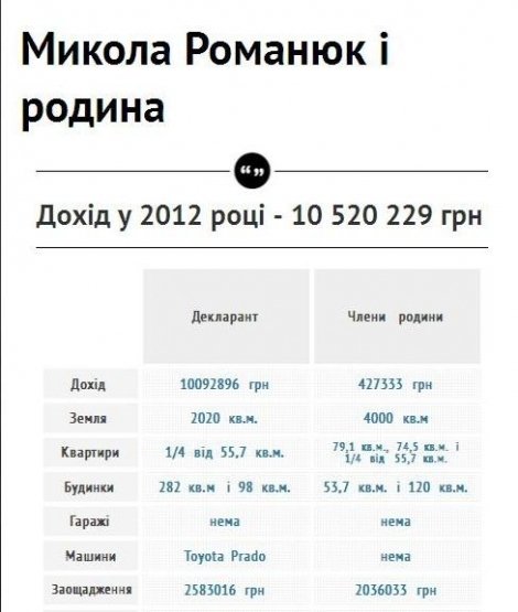 У родини Романюка – нерухомості більше. Зокрема дві діляночки загальною площею 4 тисячі квадратних метрів. Також на них записані дві квартири (79,1 кв.м. і 74,5 кв.м.), житловий будинок (53,7 кв.м.), дачний будинок (120 кв.м.) чверть квартири площею 55,7 «квадратів».