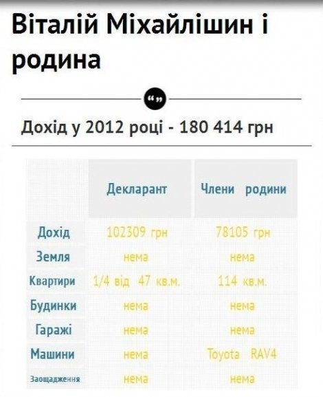 У Михайлішина, крім одної чверті квартири площею 47 кв.м., немає ніякої нерухомості та жодного транспортного засобу. Але на членів його сім’ї записані у декларації квартира загальною площею 114 кв.м. та автомобіль Toyota RAV4 (2012 року випуску).