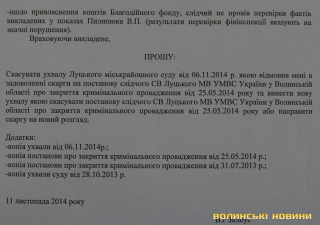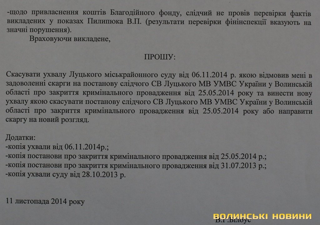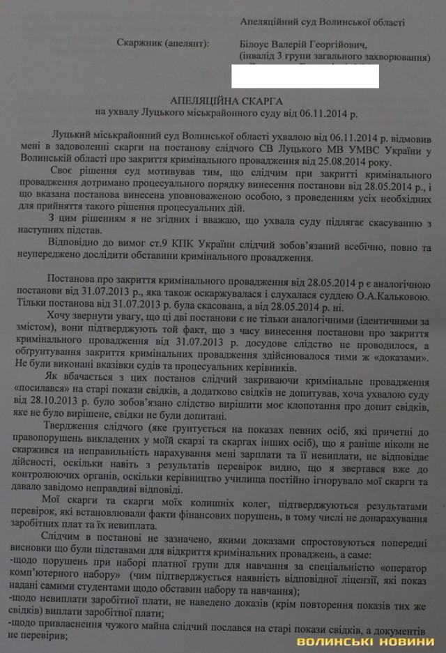 «Мене звільнили через те, що ми подали колективну скаргу на зловживання керівником навчального закладу службовим становищем. У ній йшлося про розтрату майна та отримання неправомірної вигоди від студентів. Потім суд мене поновив на роботі і знову була апеляція, яка скасувала суд першої інстанції. Далі ми звернулися у вищий апеляційний суд, там сказали, що адвокатом не правильно підготовлена скарга і наше звернення не розглянули. Окрім того, слідчий, за підписом прокурора, закрив кримінальне провадження, буцімто, за відсутністю складу кримінального злочину. Я звернувся в Луцький міськрайонний суд, але вони відхилили скаргу», - розповідає у коментарі Інформаційному агентству Волинські Новини Валерій Білоус.«У скарзі в Апеляційний суд Волинської області йдеться: «Своє рішення суд першої інстанції мотивував тим, що слідчим, при закритті кримінального провадження, дотримано процесуального порядку». З рішенням я не згідний. Як вбачається, слідчий закриваючи кримінальне провадження, посилався на старі докази свідків, а додаткових свідків не допитував, хоча судовою ухвалою від 28.10.2013-го року було це зобов’язано.