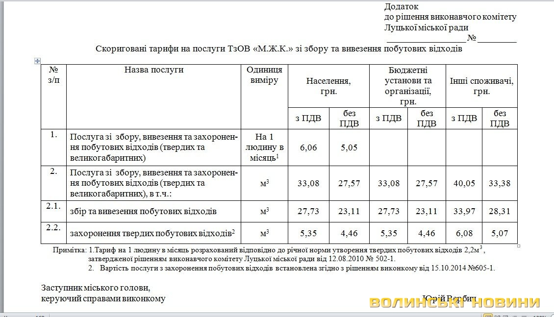 Зокрема, начальник управління економіки Любов Ковпак повідомила, що коригування тарифів на послуги зі збору та вивезення побутових відходів зумовлене збільшенням цін на паливно-мастильні матеріали. З її слів, вартість бензину в діючому тарифі закладена в обсязі 9,4 гривні, а дизпалива — 9,75 гривні. Оскільки ціни на пальне за останні кілька місяців на порядок збільшилися, то надавати послуги за старою ціною нині підприємству нерентабельно. Крім того, збільшилася вартість послуг із захоронення побутових відходів на полігоні у селі Брище. До слова, відповідні зміни до тарифів минулого місяця члени виконкому затверджували для КП «Луцькспецкомунтранс».