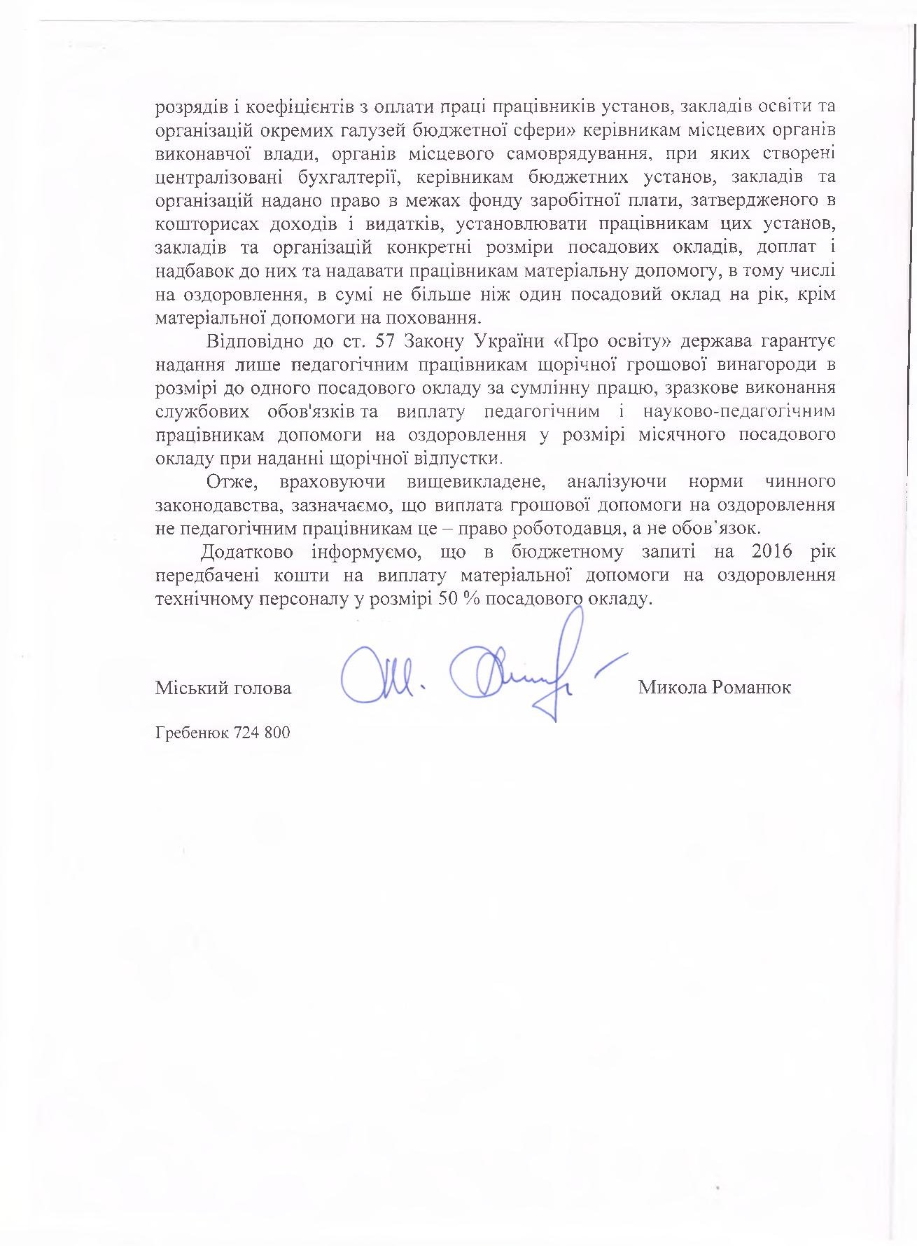 Зокрема, у документі зазначено, що «виплата грошової допомоги на оздоровлення не педагогічним працівникам це – право роботодавця, а не обов’язок. Однак, у бюджетному запиті на 2016 рік передбачені кошти на виплату матеріальної допомоги на оздоровлення технічному персоналу у розмірі 50 % посадового окладу».